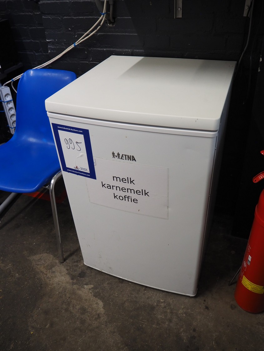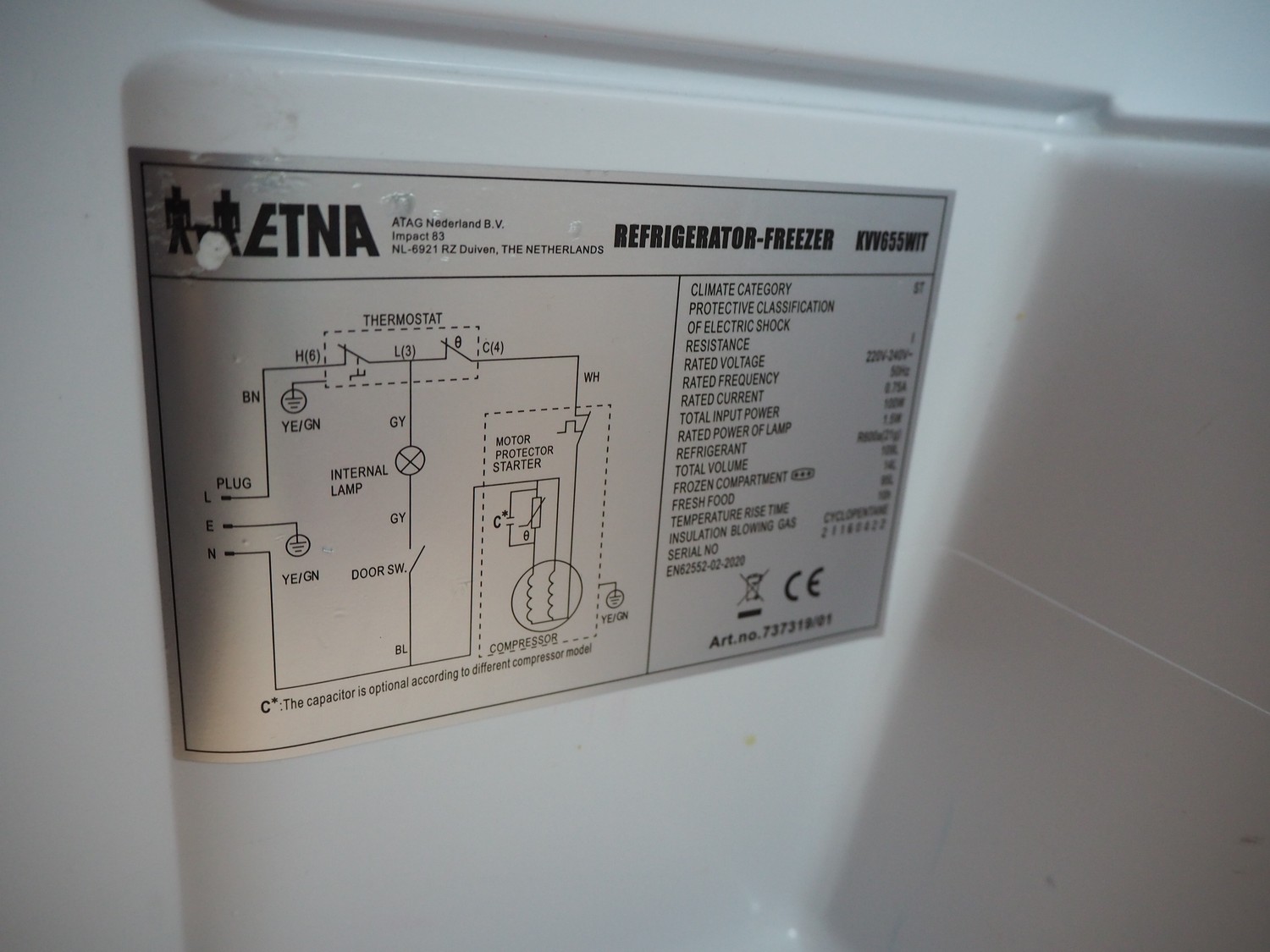 Etna refrigerator, model: KVV655WIT, serial number: 21162422, 220/240 V, 1 Ph, 50 Hz, 0.75 A, 100 W, refrigerant: R600a, 21 g, volume: 109 litre, dimensions: 550 mm x 600 mm x 870 mm.