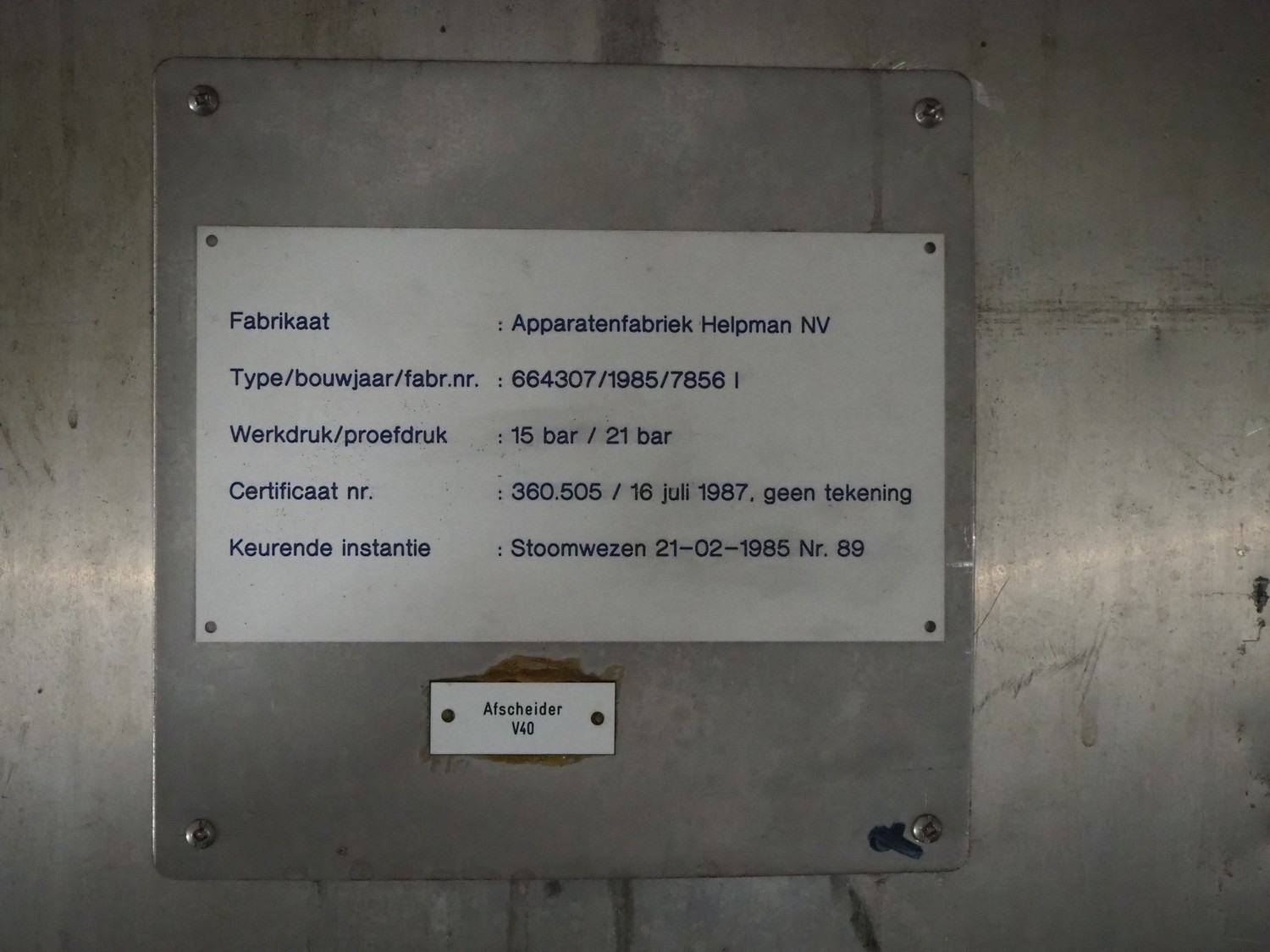 Apparatenfabriek Helpman NV ammonia separation vessel, type: 664307, fabrication number: 7856, year of construction: 1985, working pressure: 15 bar, dimensions: Ø 1500 mm x 6000 mm.