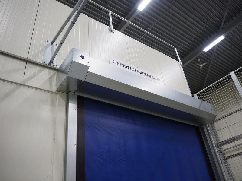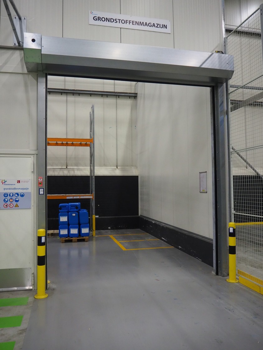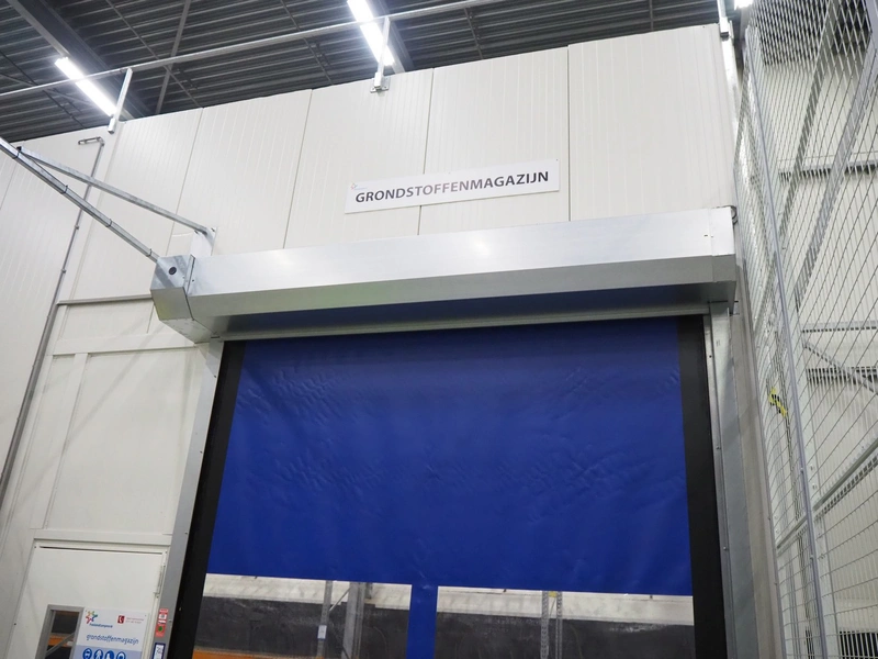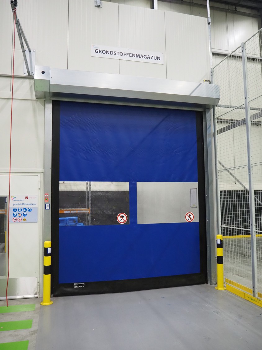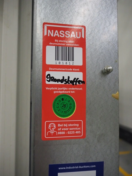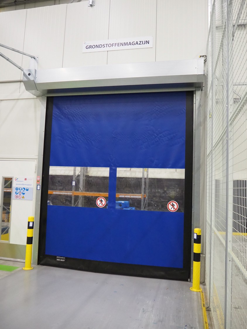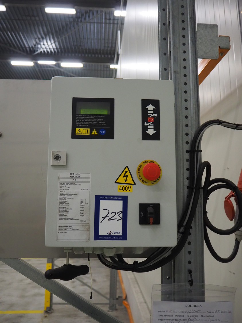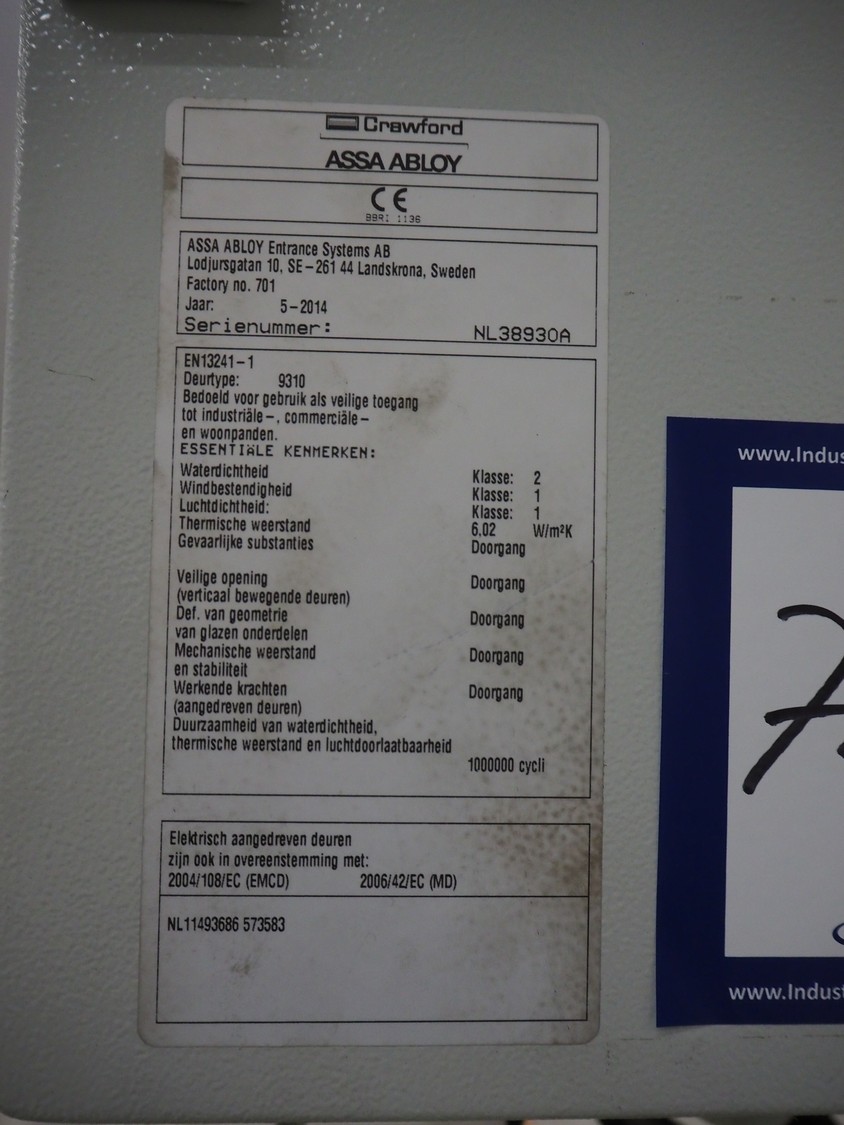 Crawfod / Assa Abloy electrical high speed shutter door, type: 9310, serial number: NL389330A, year of construction: 05/2014. clearance: 3000 mm x 3400 mm, total dimensions: 3400 mm x 4010 mm x 3900 mm, dimensions control cabinet: 300 mm x 130 mm x 400 mm.