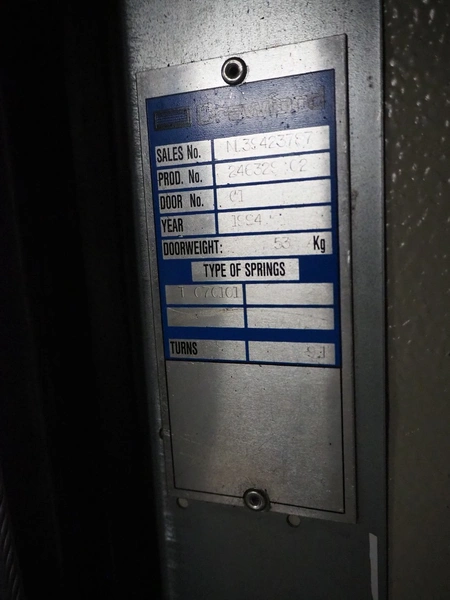Crawford electric overhead door, type: C1, year of construction: 1994, dimensions door: 1600 mm x 1950 mm, rail length: 5000 mm, dimensions control cabinet: 200 mm x 160 mm x 370 mm.