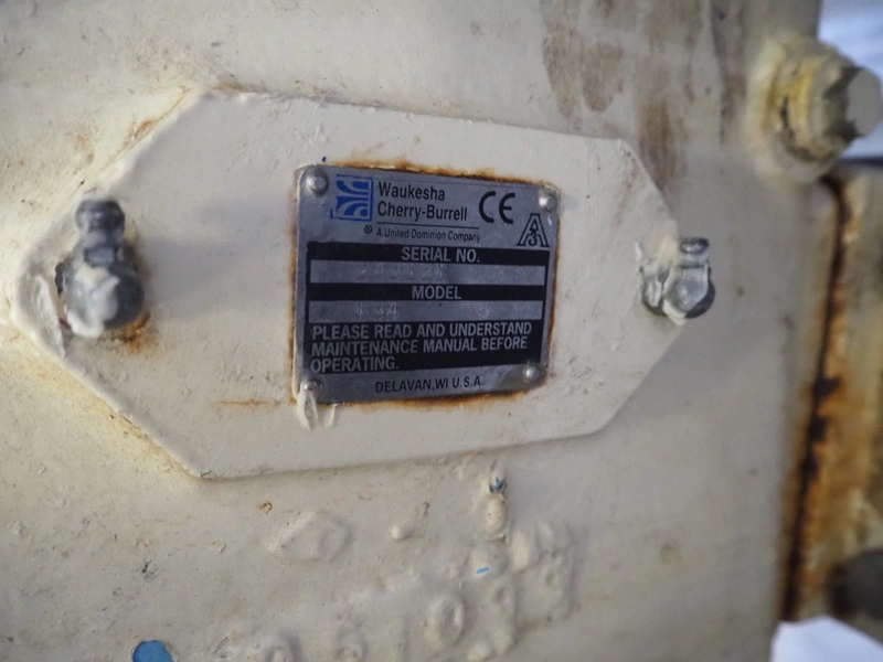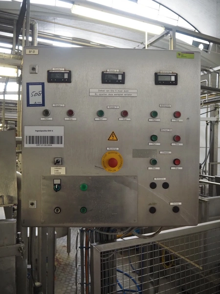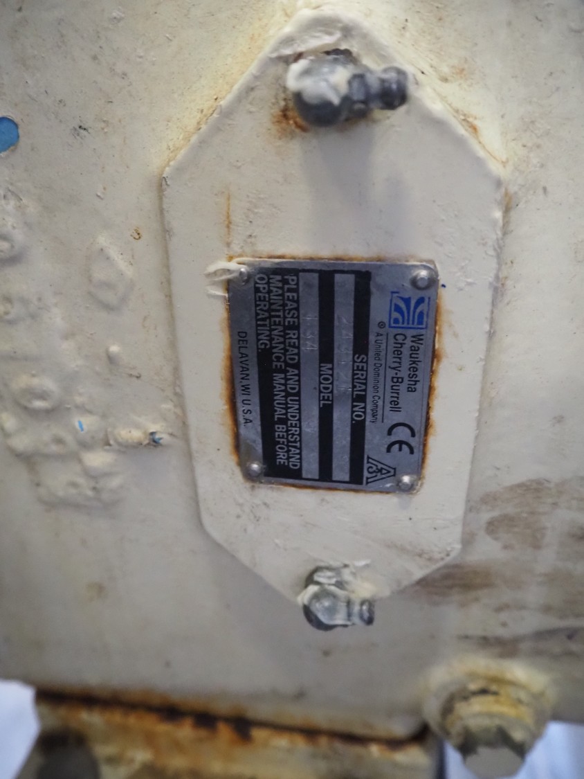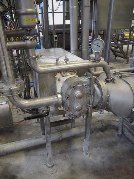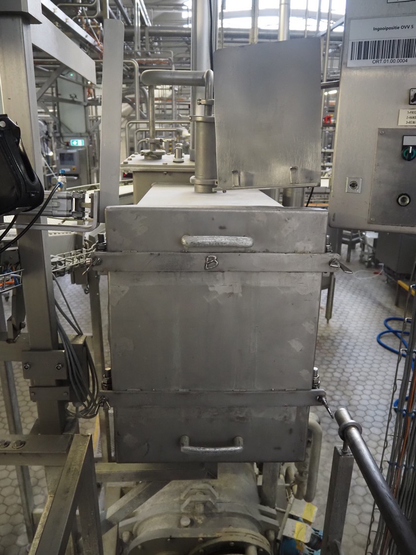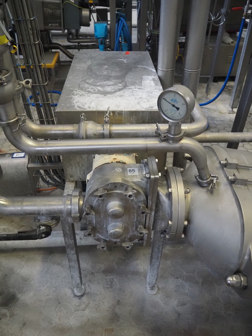 APV butter reworker, consisting of: double screw reworker, clearance: 600 mm x 400 mm, Waukescha Cherry Burrel lobe pump, model: 134, serial number: 243121, APV centrifugal pump, various valves, total dimensions: 5100 mm x 1900 mm x 3700 mm. Including s/s platform, working height: 1180 mm, total dimensions: 3200 mm x 700 mm x 2200 mm and 2 switch cabinets.