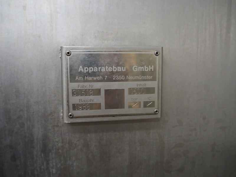Apperatebau GmbH butter buffer tank with 2 screws, factory number: 30518, year of construction: 1988, capacity: 1500 litre, dimensions: 2650 mm x 1700 mm x 2650 mm.