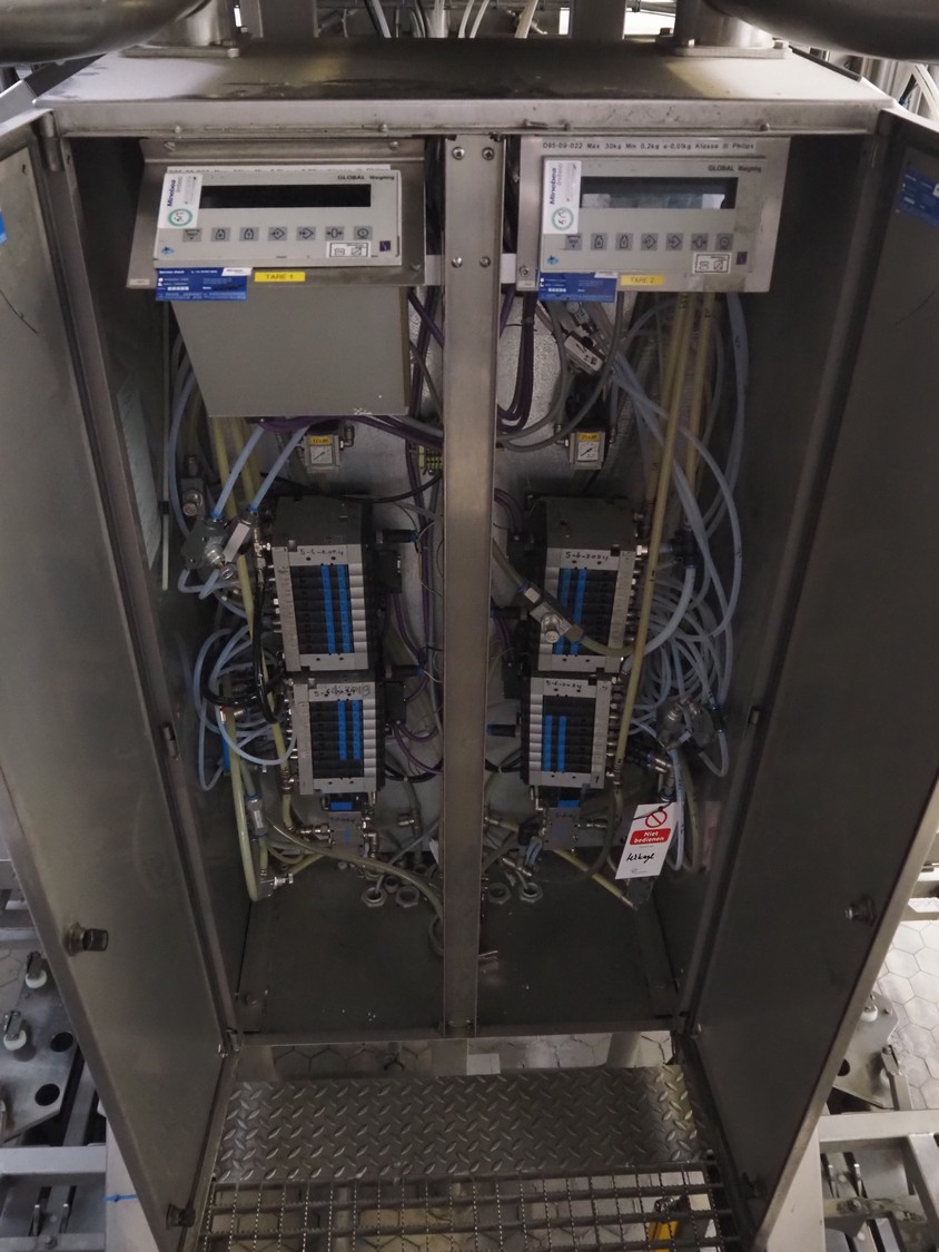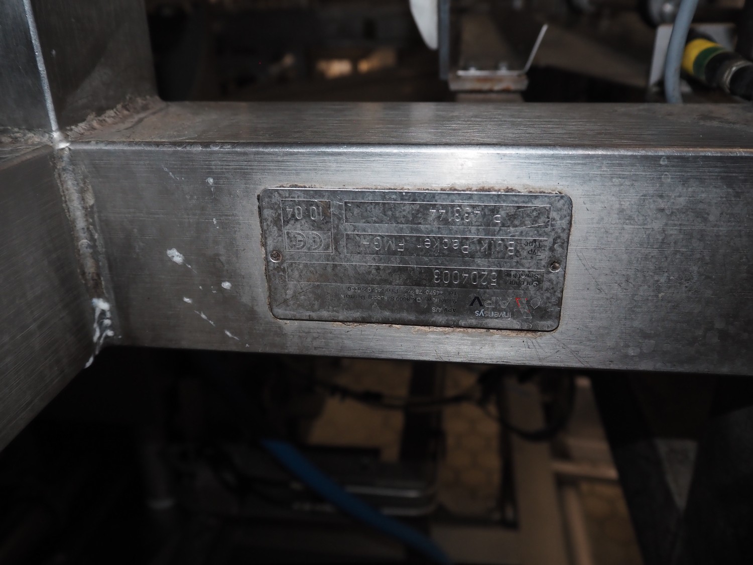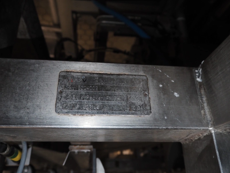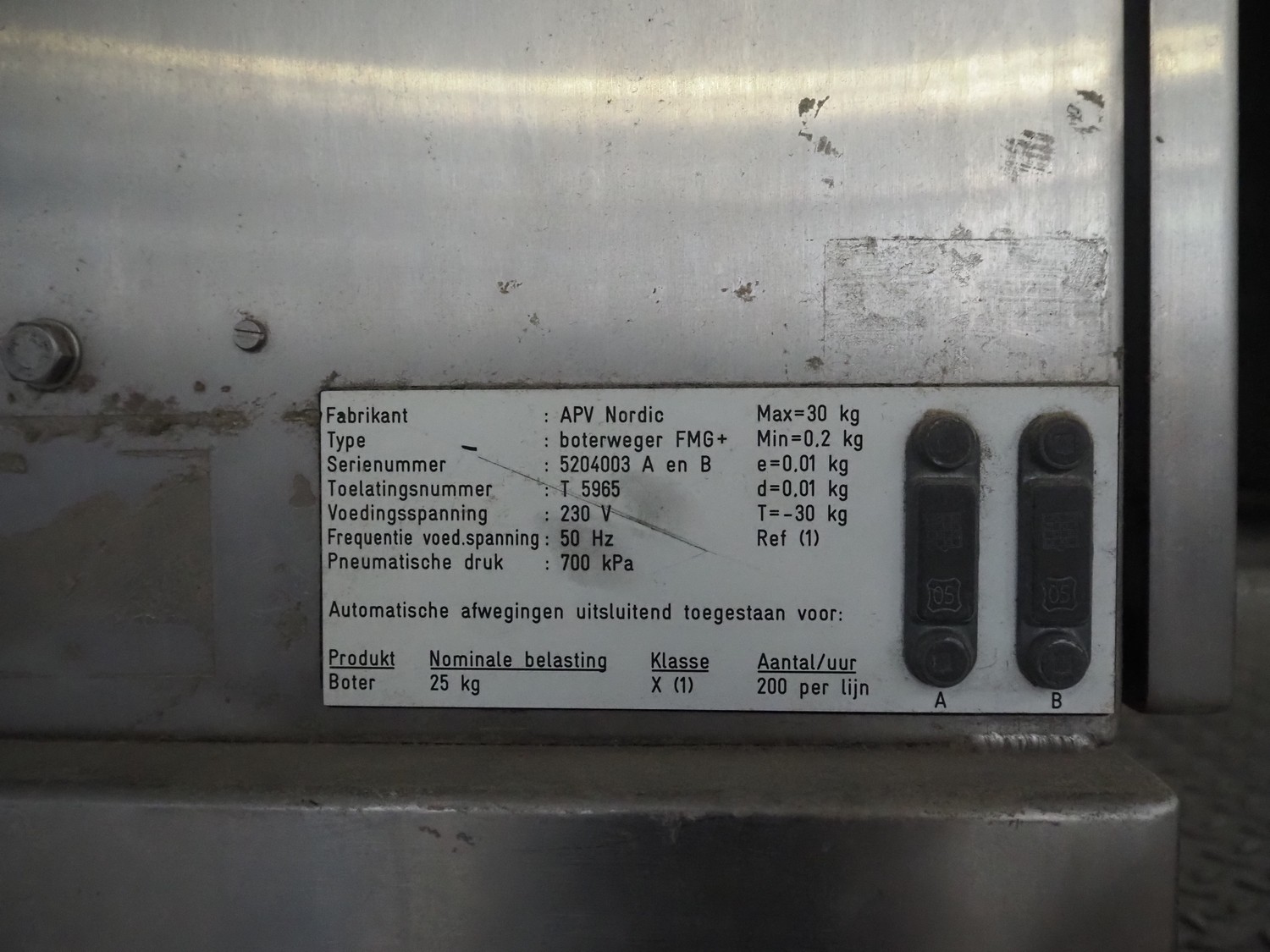 APV double butter bulk packaging machine, type: Bulk Packer FMG+, serial number: 5204003, capacity: 10.000 kg/h, 25 kg carton boxes, maximum weighing capacity: 30 kg, minimum weighing capacity: 0.2 kg, clearance box infeed: 670 mm x 550 mm, filling dye: 380 mm x 280 mm, total dimensions: 7200 mm x 4800 mm x 4300 mm, dimensions switch cabinets: (2x) 600 mm x 500 mm x 1250 mm.
