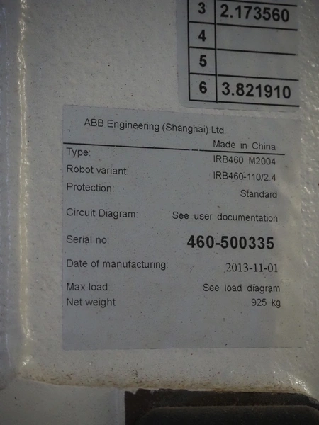 - ABB robot, type: IRB460 M2004, serial number: 460-500335, year of construction: 01/11/2013, weight: 925 kg, dimensions: 2300 mm x 1400 mm x 2900 mm;