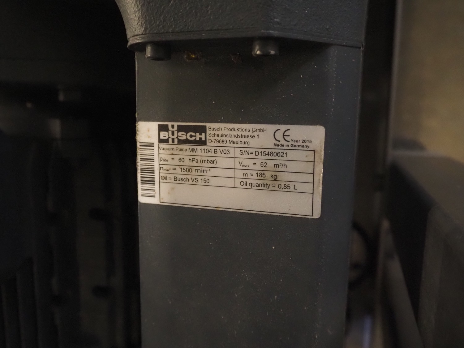 - Busch vacuum pump, type: MM 1104 B V03, serial number: D15480621, capacity: 62 m³/h;