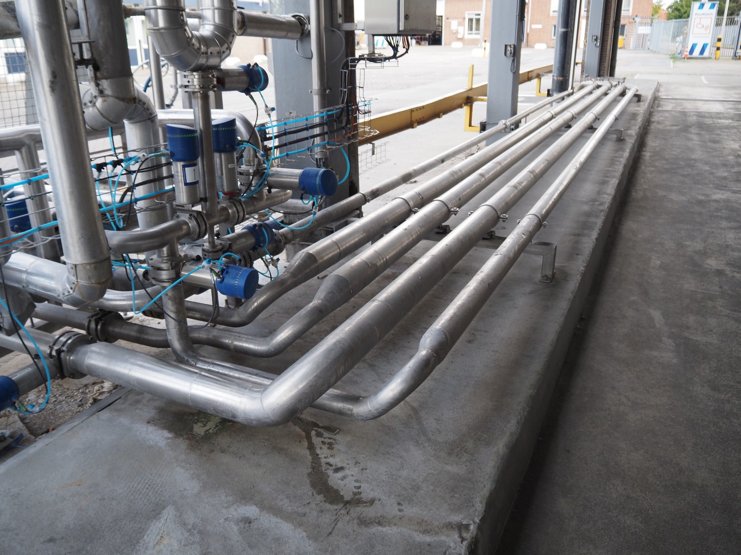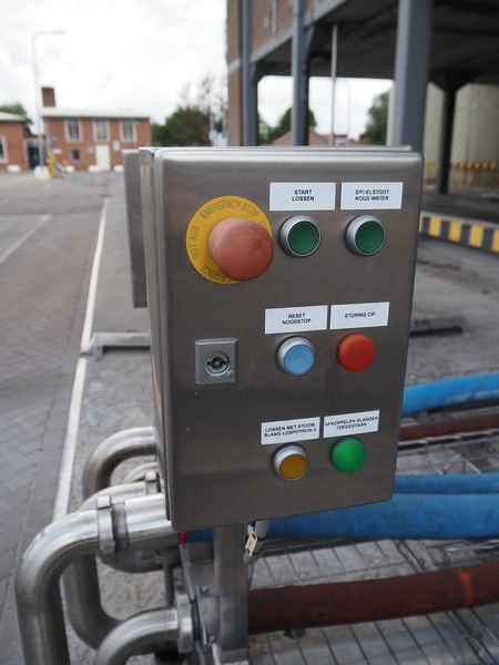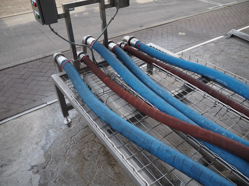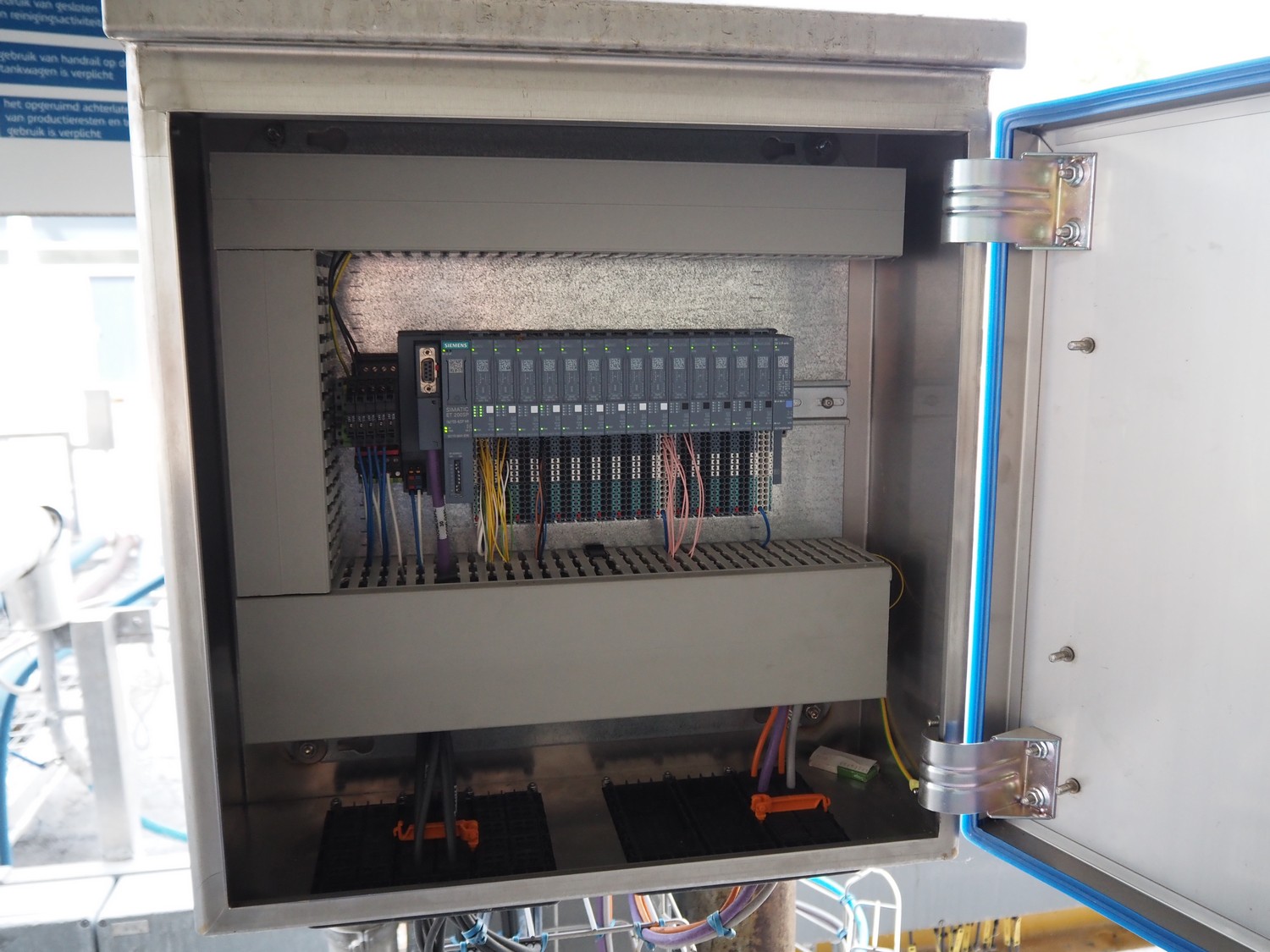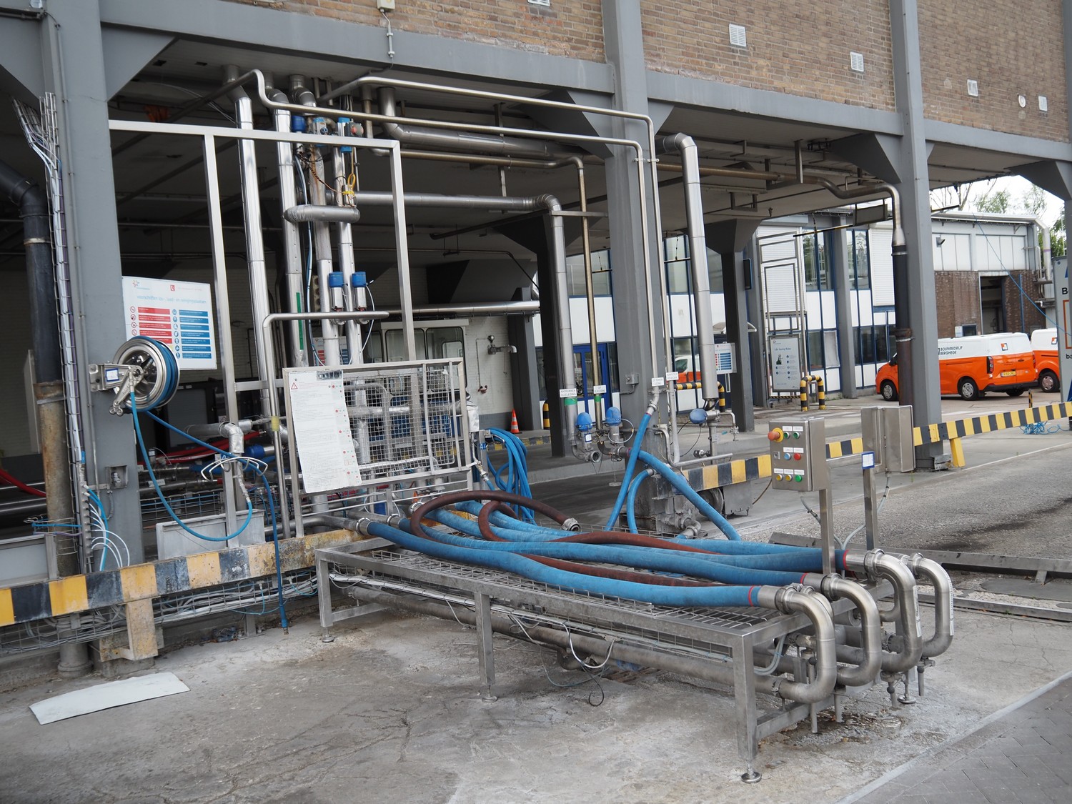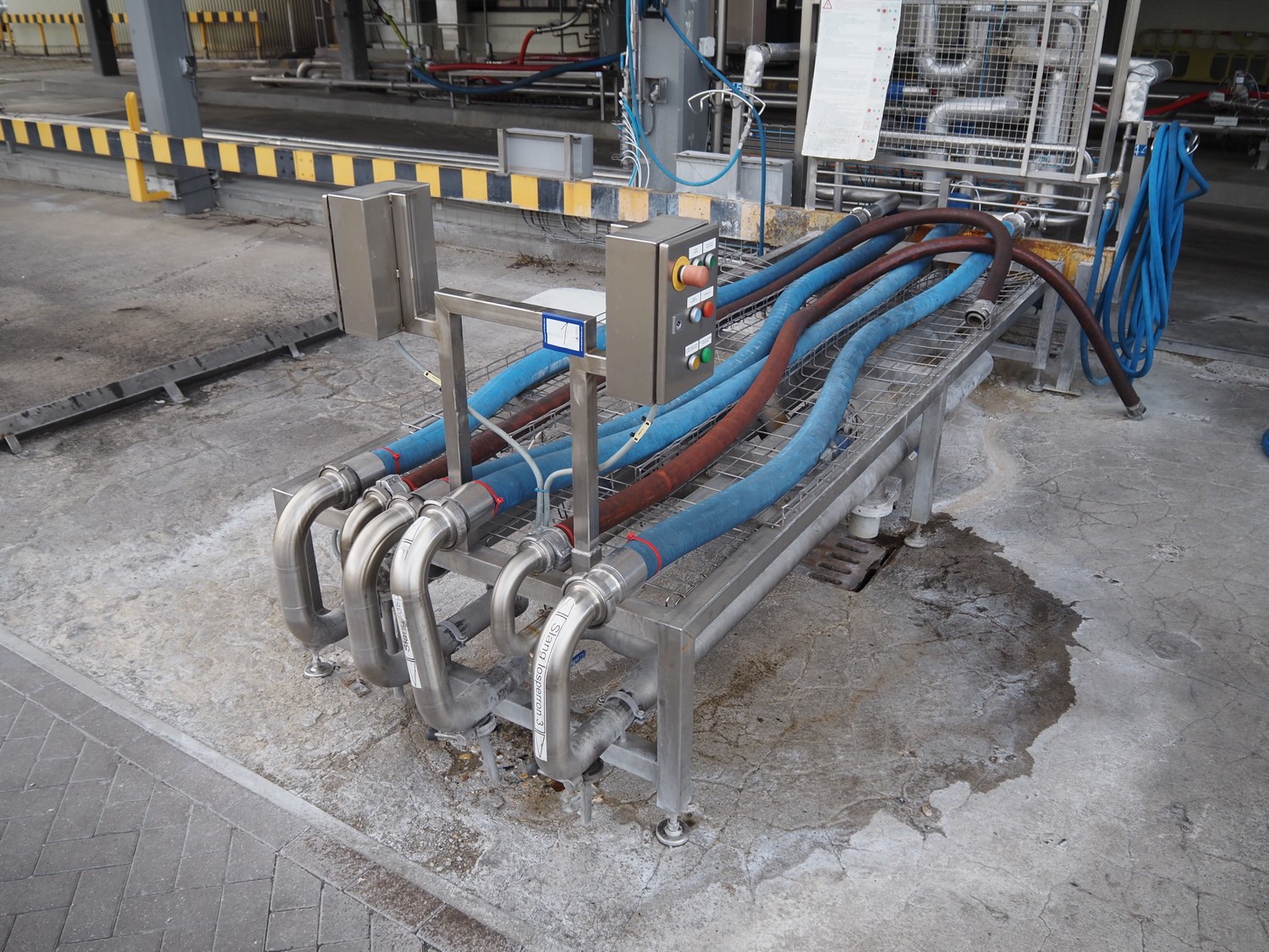 Raw milk unloading station with various hoses, s/s pipes, switch cabinets and valves, total dimensions: 5300 mm x 3100 mm x 2500 mm.