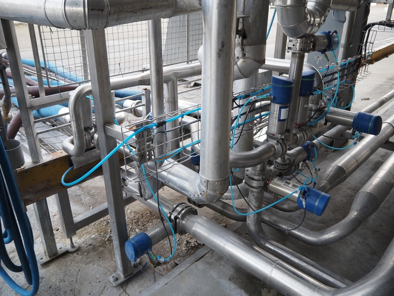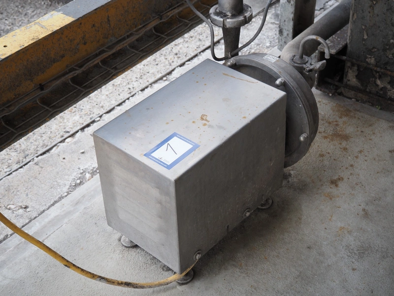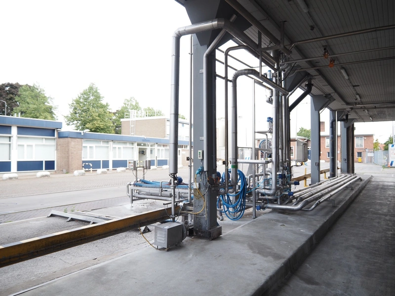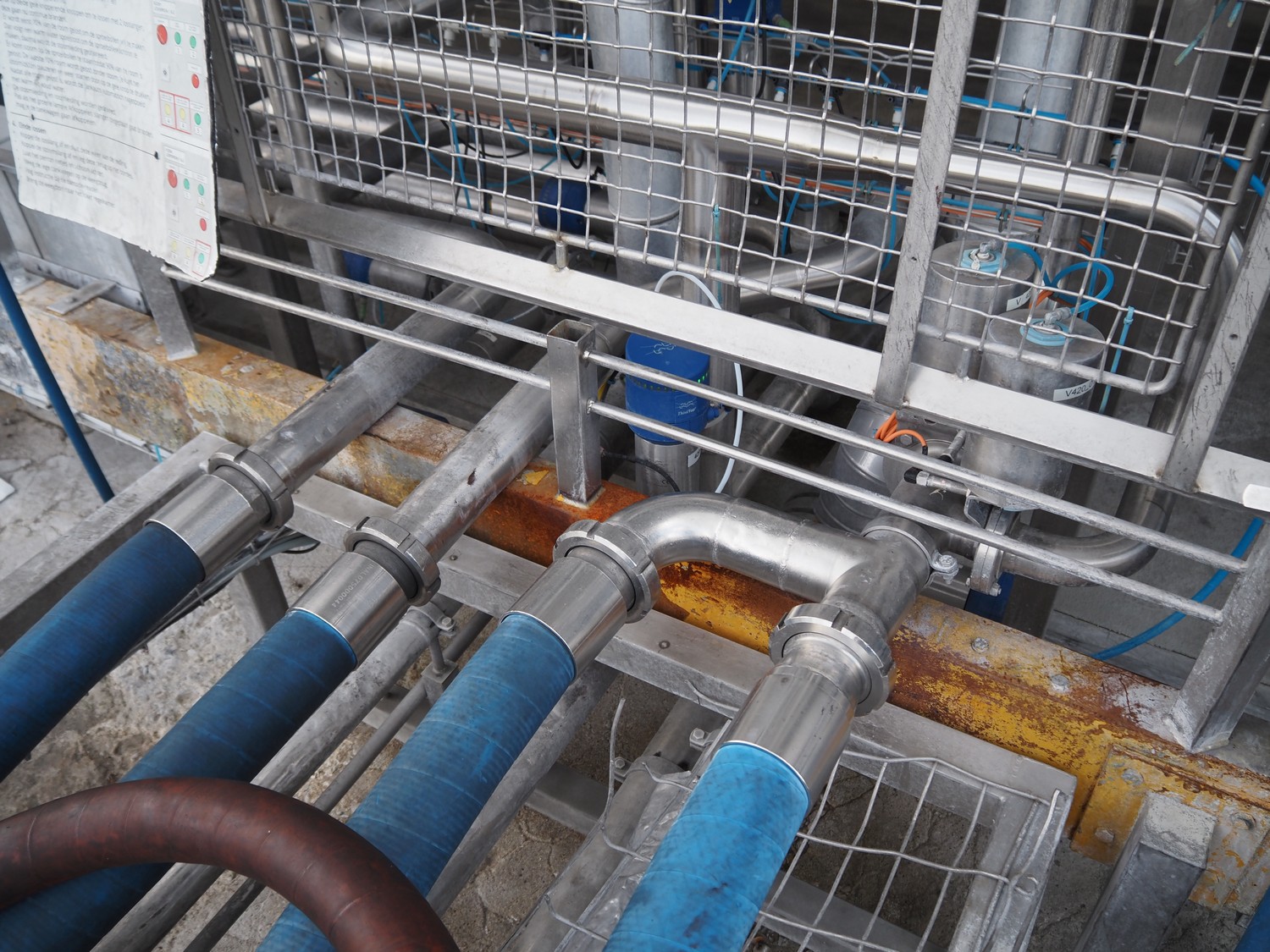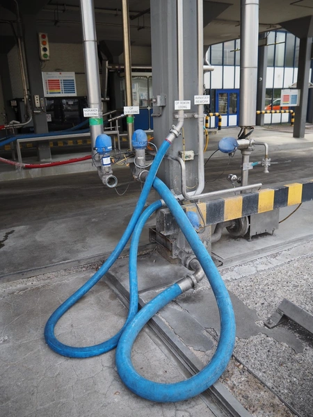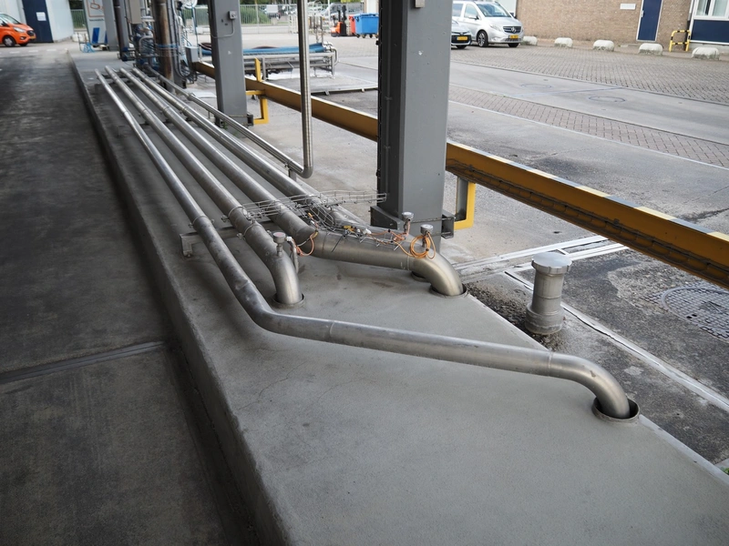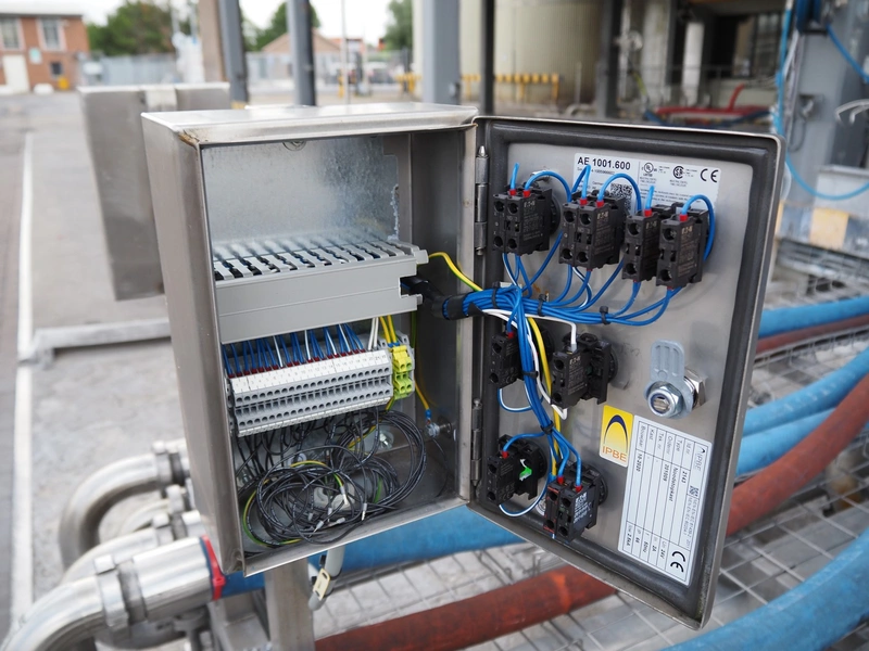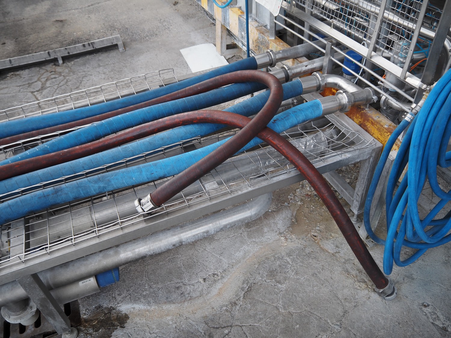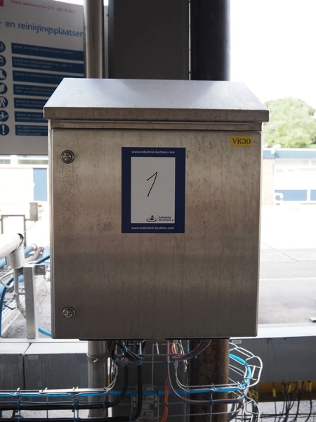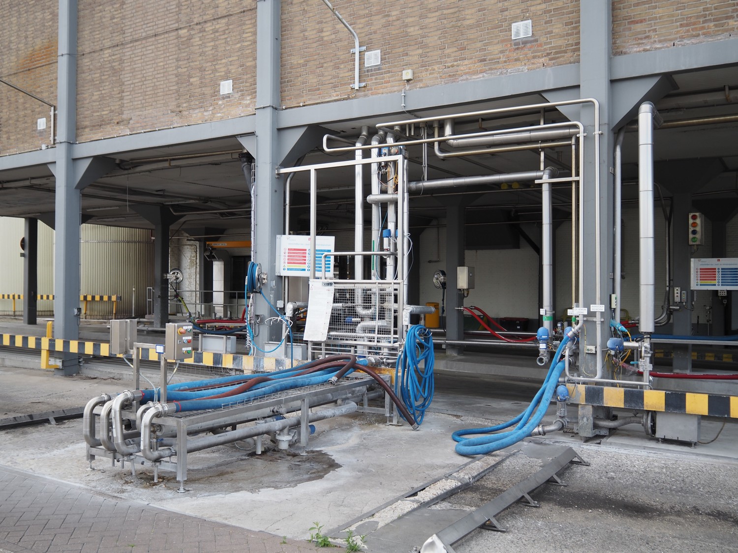 Raw milk unloading station with various hoses, s/s pipes, switch cabinets and valves, total dimensions: 5300 mm x 3100 mm x 2500 mm.