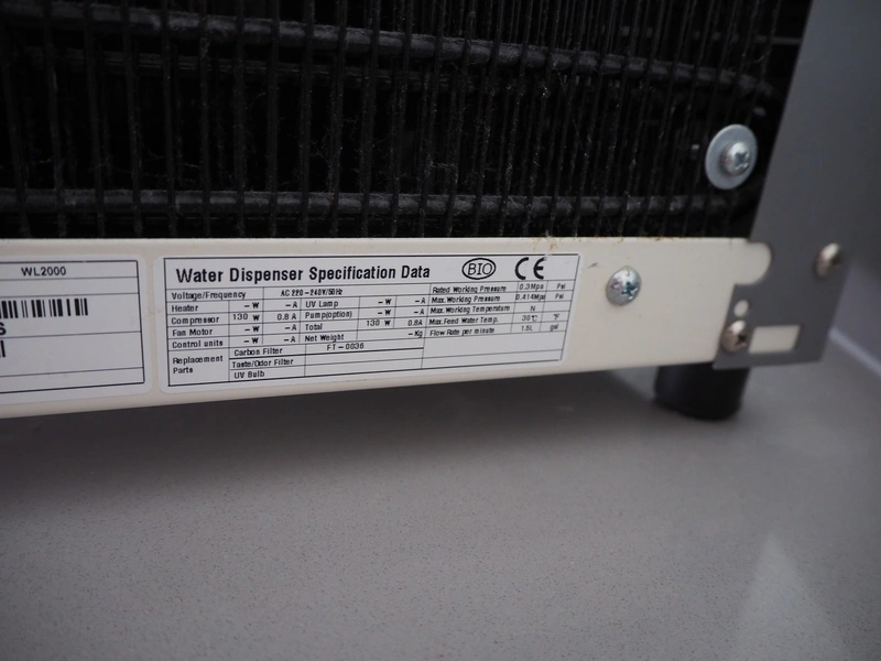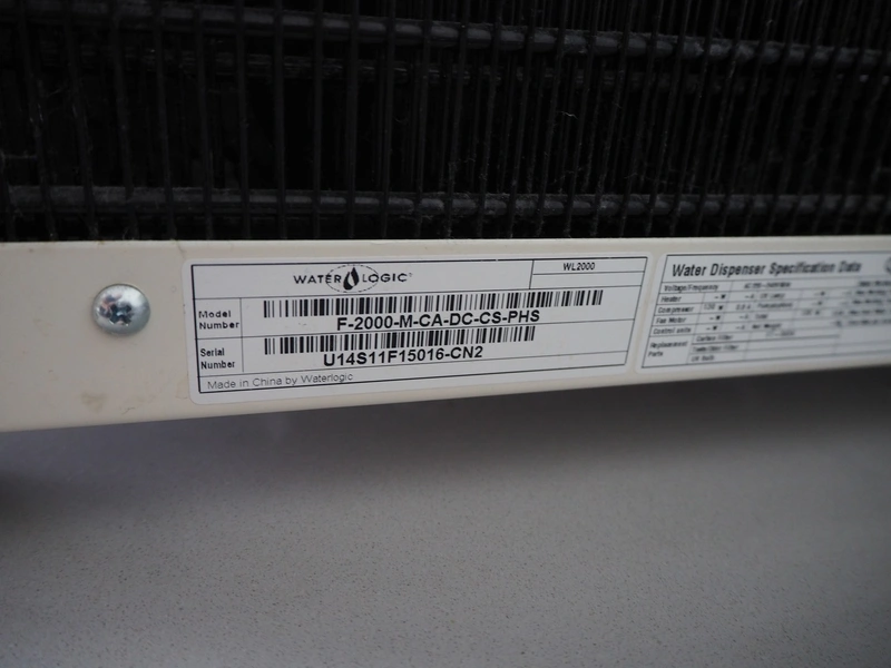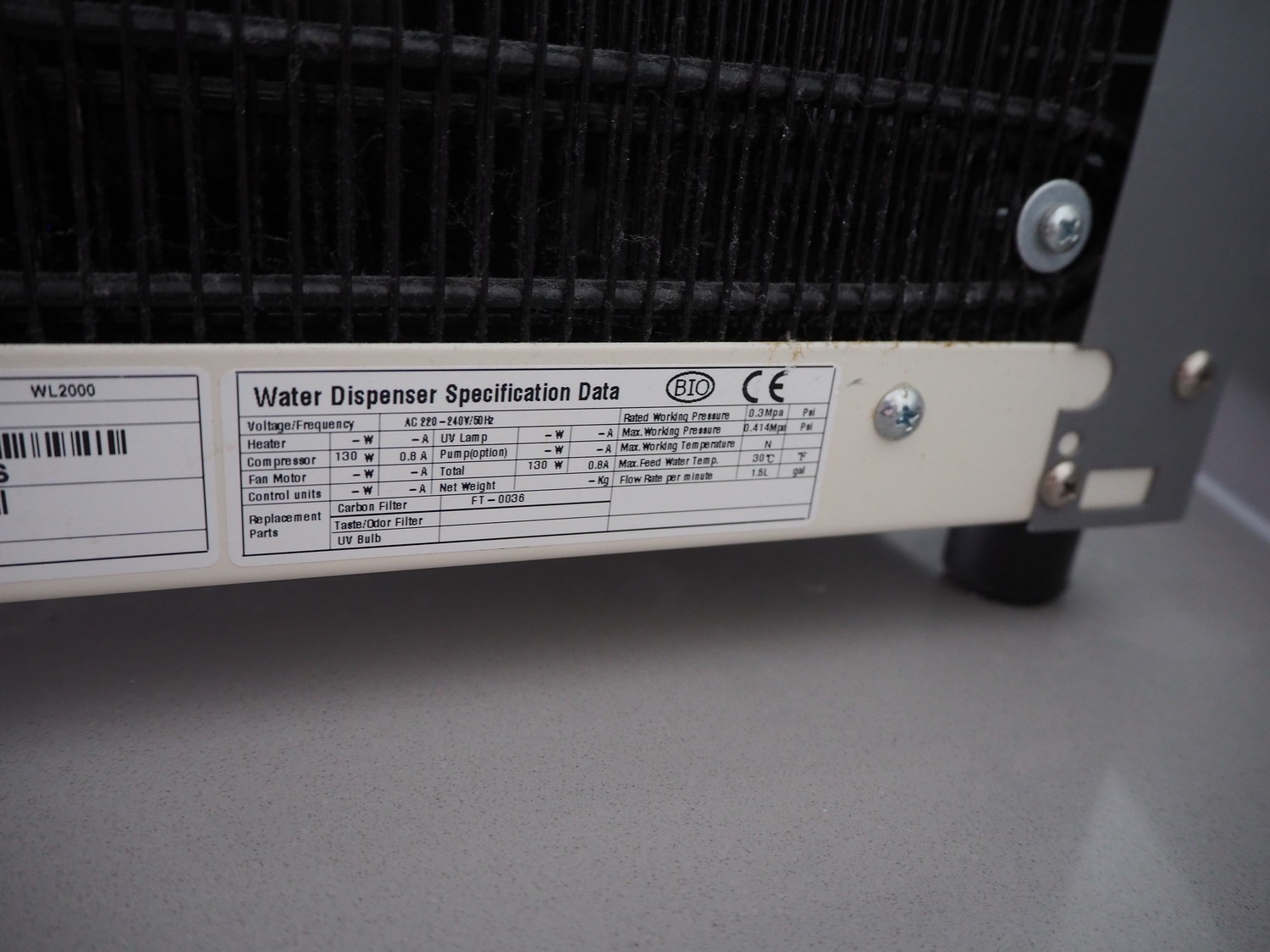 Waterlogic water dispenser, model: F-2000-M-CA-DC-CS-PHS, serial number: U14S11F15016-CN2, dimensions: 340 mm x 370 mm x 480 mm.
