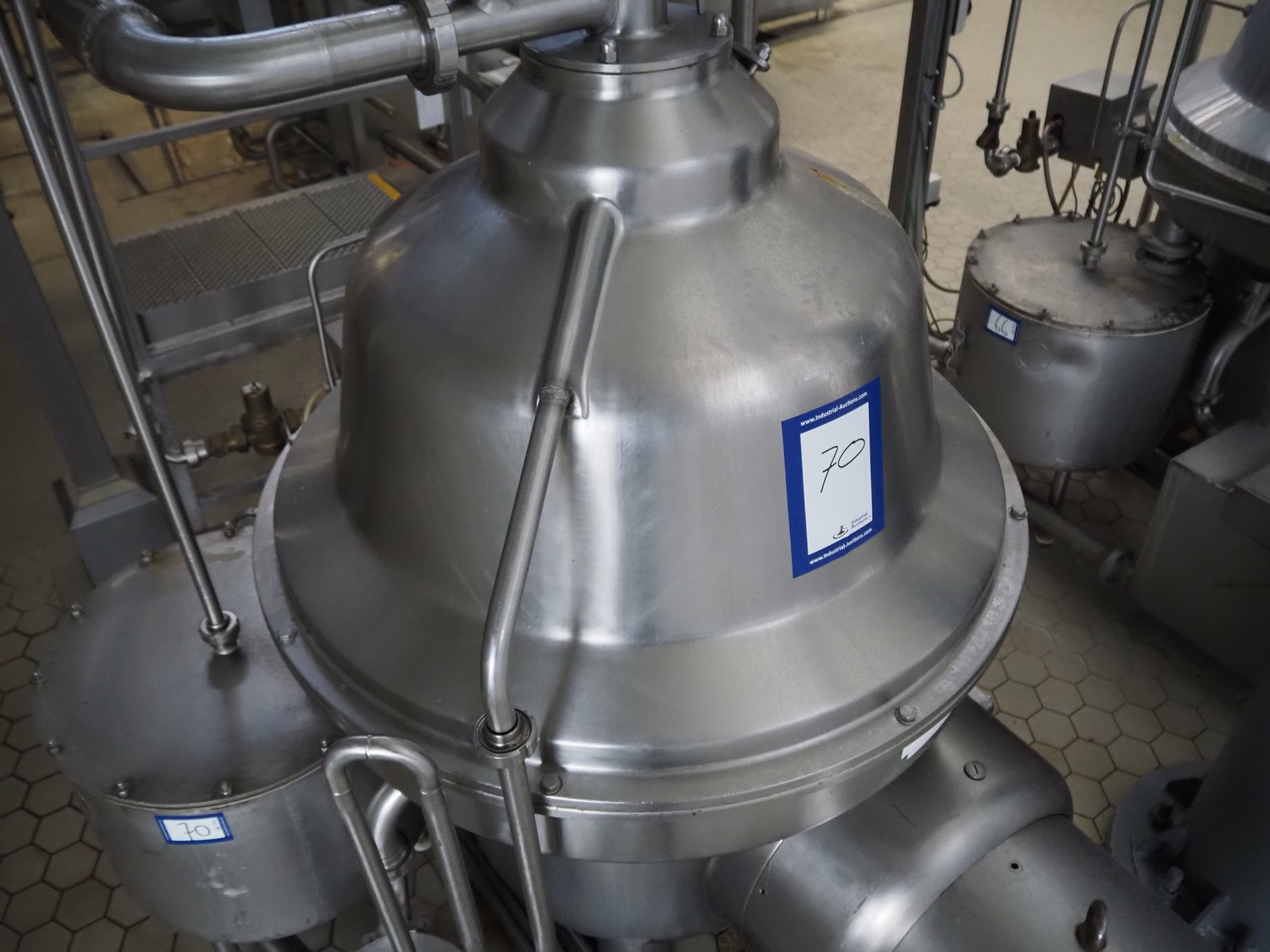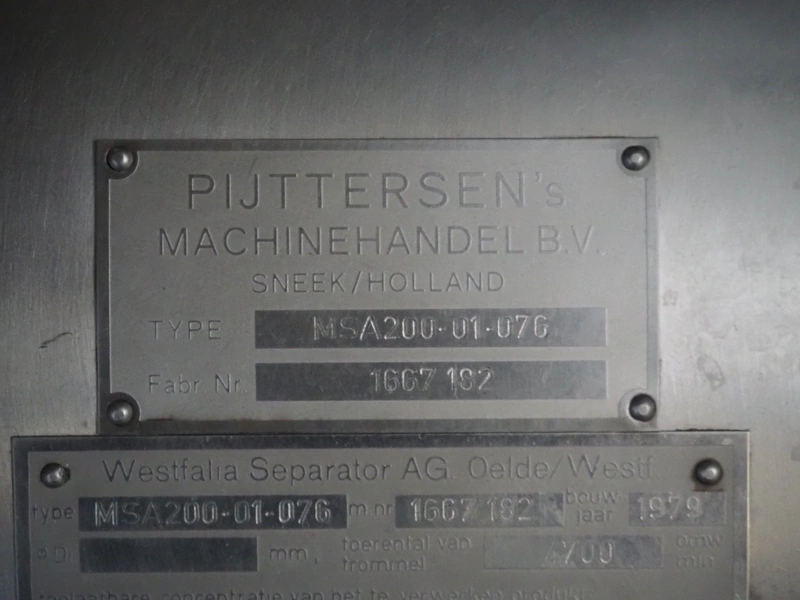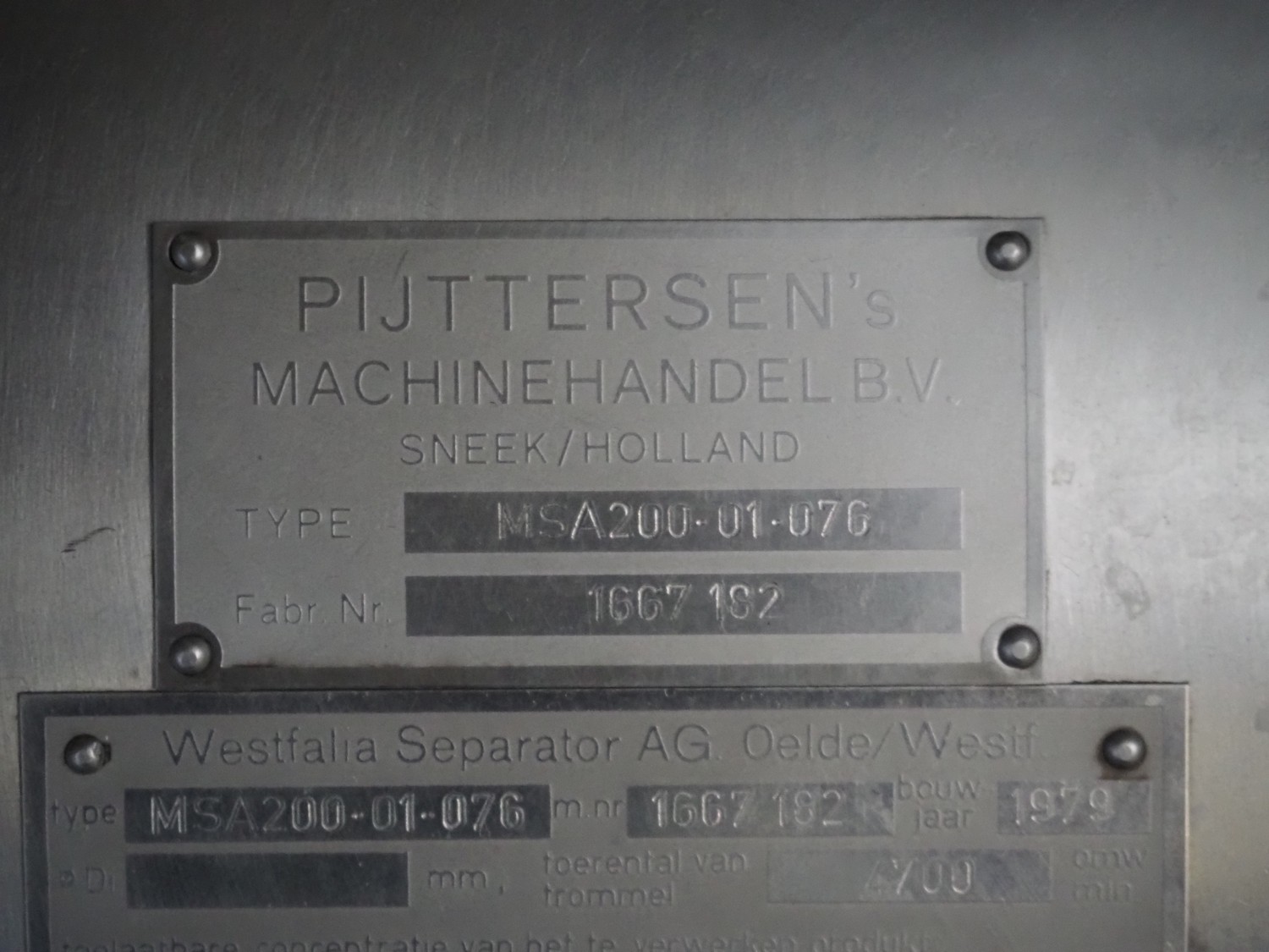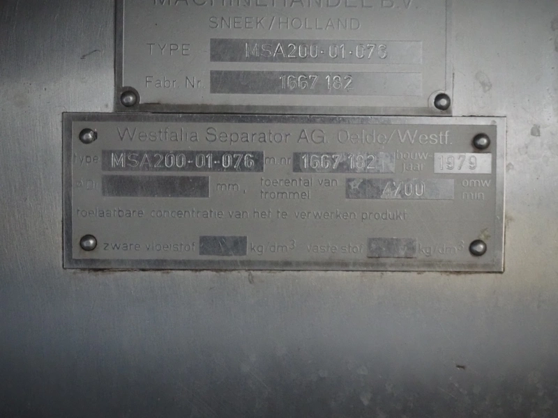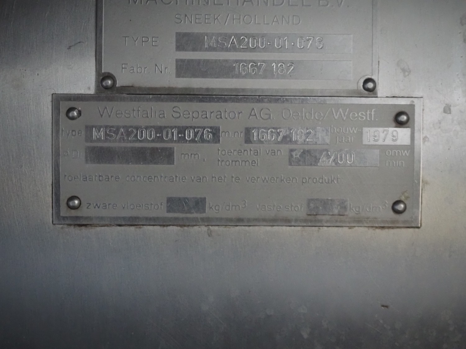 Westfalia Separator AG milk-cream separator, type: MSA200-01-076, machine number: 1667 182, year of construction: 1979, drum speed: 4700 rpm, dimensions: 2050 mm x 1500 mm x 1950 mm. Tools are not included, they are sold separately.