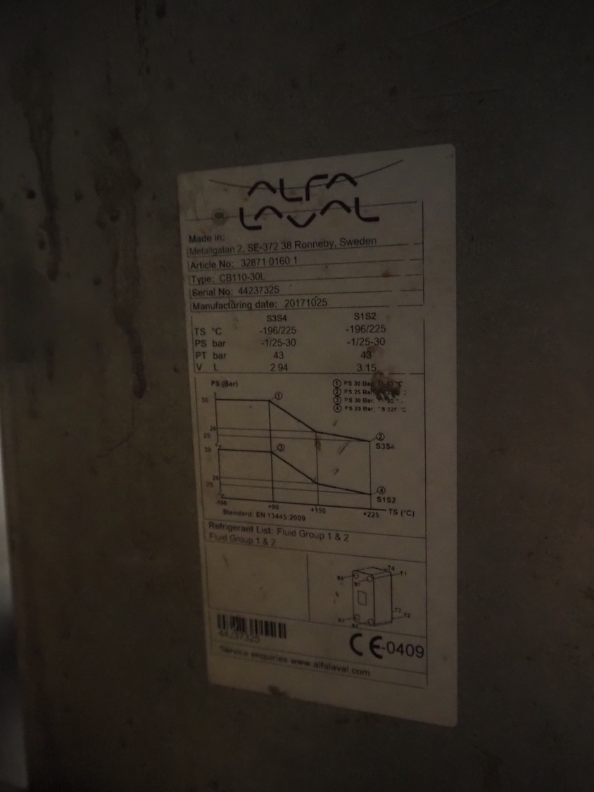 Alfa Laval plate heat exchanger, type: CB110-30L, serial number: 44237235, year of construction: 2017, temperature range: -196/+225°C, with valves, dimensions: 340 mm x 160 mm x 650 mm.
