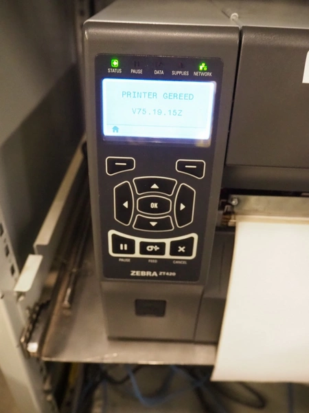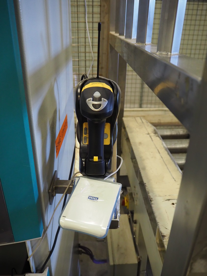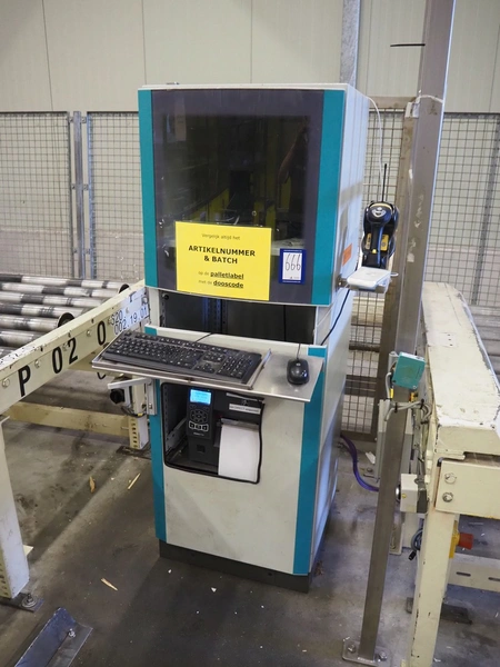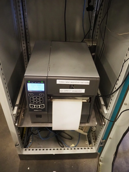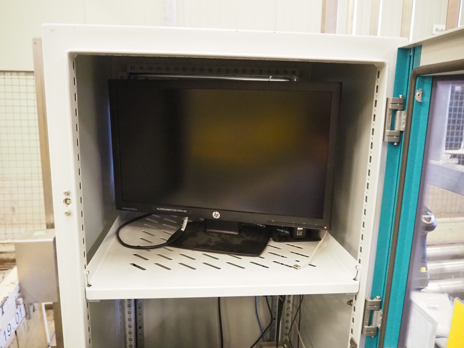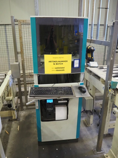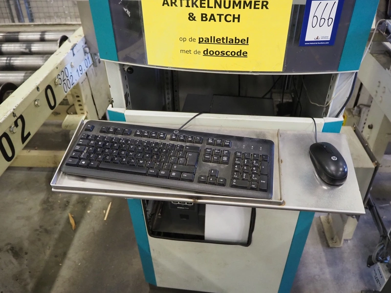 Steel computer cabinet with HP display and Zebra label printer, dimensions: 700 mm x 800 mm x 1700 mm.