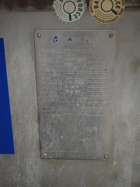 Alfa Laval / Tetra Pak cream pasteurizer, type: C10-SH, serial number: 30104-38526, year of construction: 2003, volume: 1311 litres, PS: 0/20.0 bar, PT: 28.6 bar, TS: 0/130 °C, dimensions: 5000 mm x 800 mm x 2200 mm.