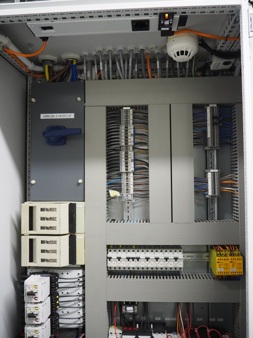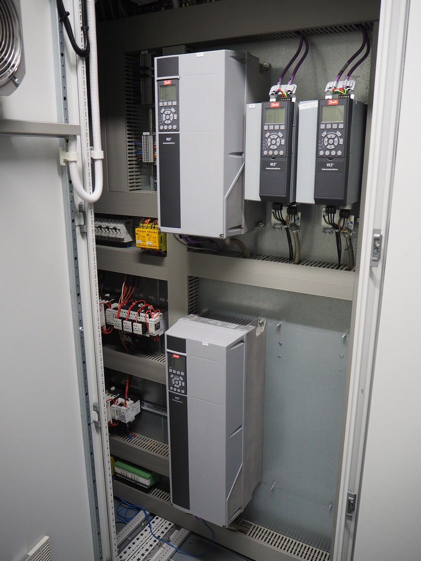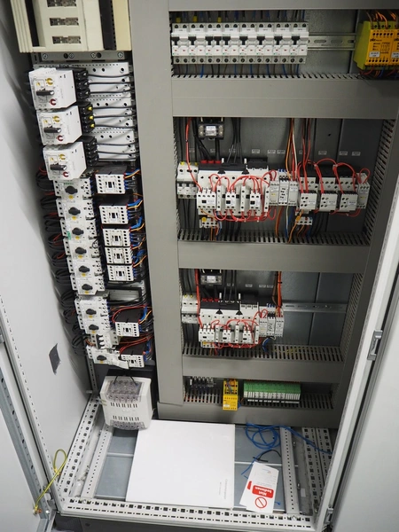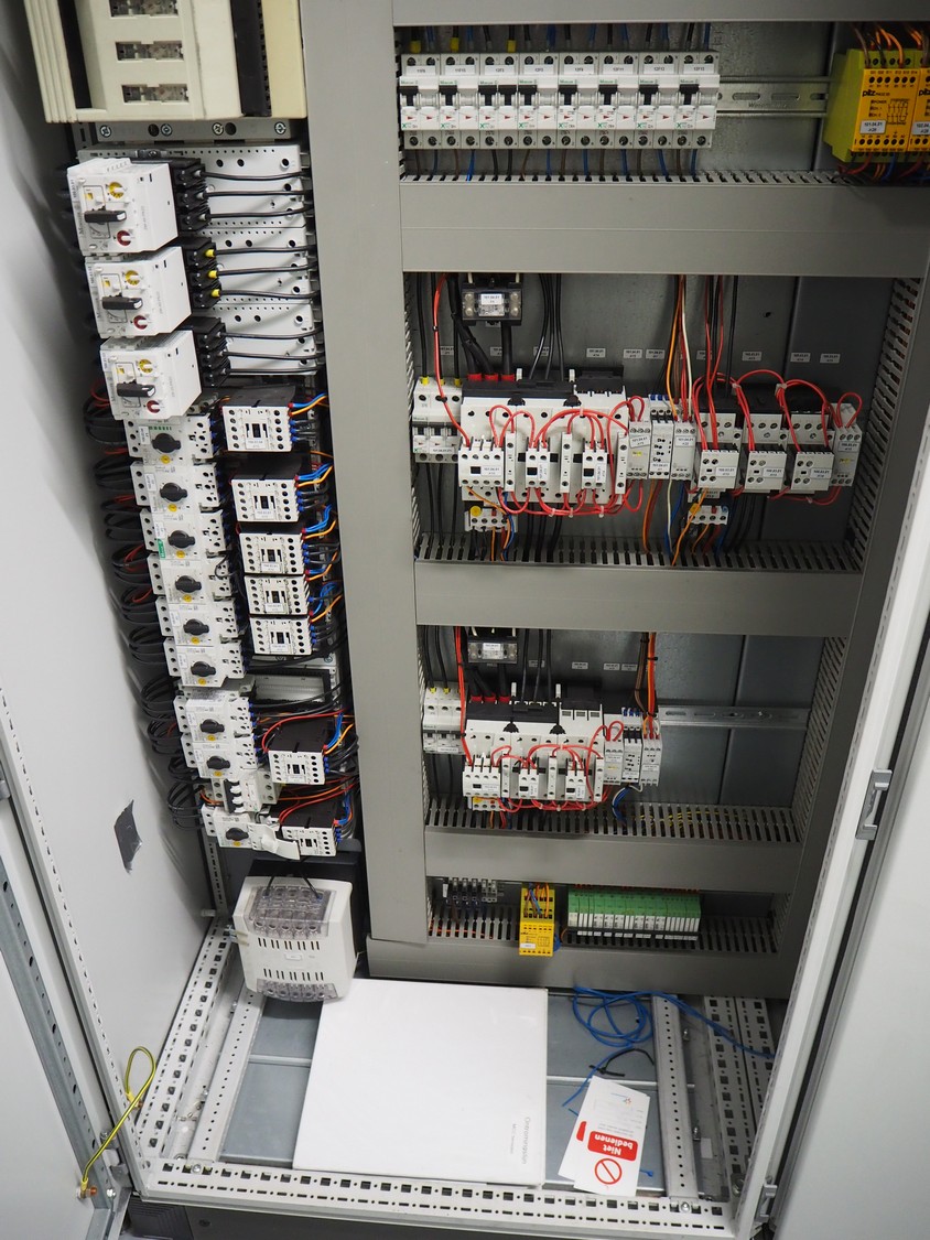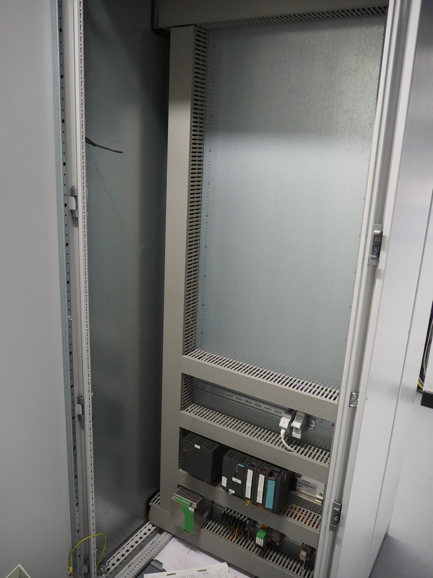 Steel switch cabinet for milk-cream separation line, dimensions: 2370 mm x 500 mm x 2100 mm.