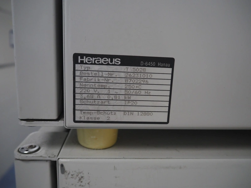Heraeus laboratory drying cabinet, type: T 5028, fabrication number: 8702296, 220 V, 1 Ph, 50/60 Hz, 3.68 A, 0.81 kW, nominal temperature: 250 °C, 2 floors, dimensions each floor: 290 mm x 250 mm, total dimensions: 510 mm x 500 mm x 540 mm.