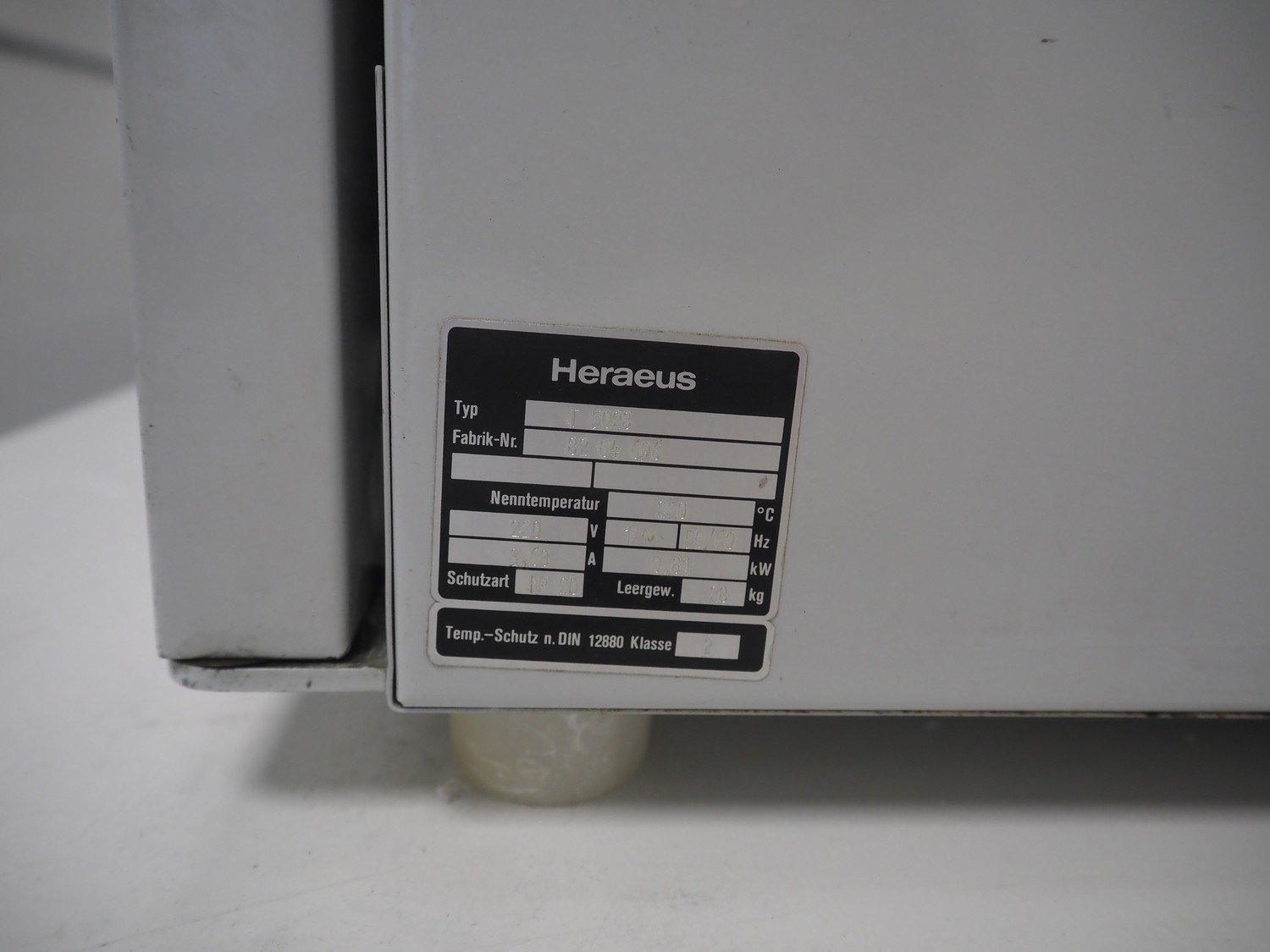 Heraeus laboratory drying cabinet, type: T 5028, fabrication number: 82 04 696, 220 V, 1 Ph, 50/60 Hz, 3.68 A, 0.81 kW, nominal temperature: 250 °C, 2 floors, weight: 28 kg, dimensions each floor: 290 mm x 250 mm, total dimensions: 510 mm x 500 mm x 540 mm.