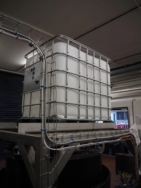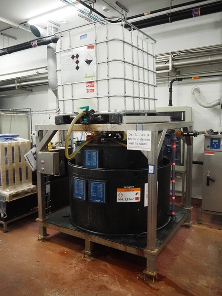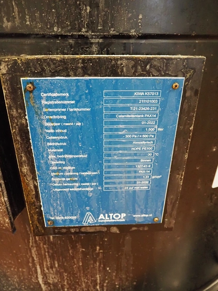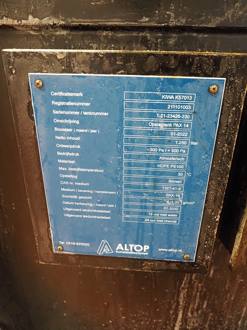 Altop plastic storage tank for PAX 14 with emergency tank on s/s frame with IBC tank on top, type storage tank: Opslagtank PAX 14, serial number: T-21-23426-230, year of construction: 01/2022, capacity: 1250 litre, type emergency tank: Calamiteitentank PAX 14, serial number: T-21-23426-231, year of construction: 01/2022, capacity: 1500 litre, dimensions: 1650 mm x 1800 mm x 2950 mm.