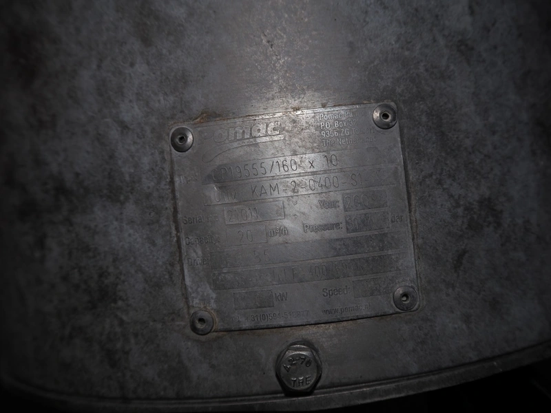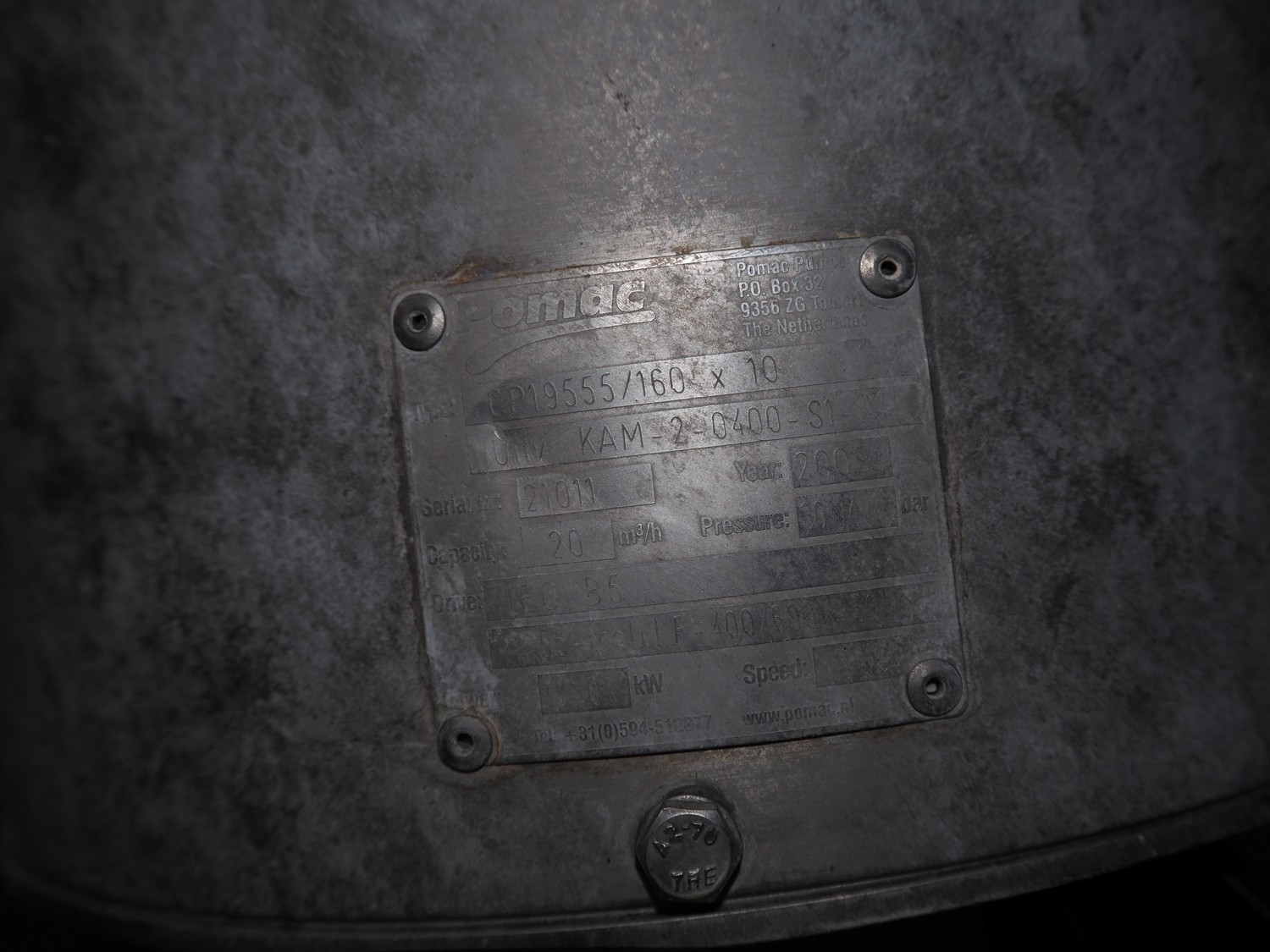 Pomac centrifugal pump, type: CP19555 / 160 x 10, serial number: 21011, year of construction: 2009, capacity: 20 m³/h, dimensions: 650 mm x 300 mm x 400 mm.