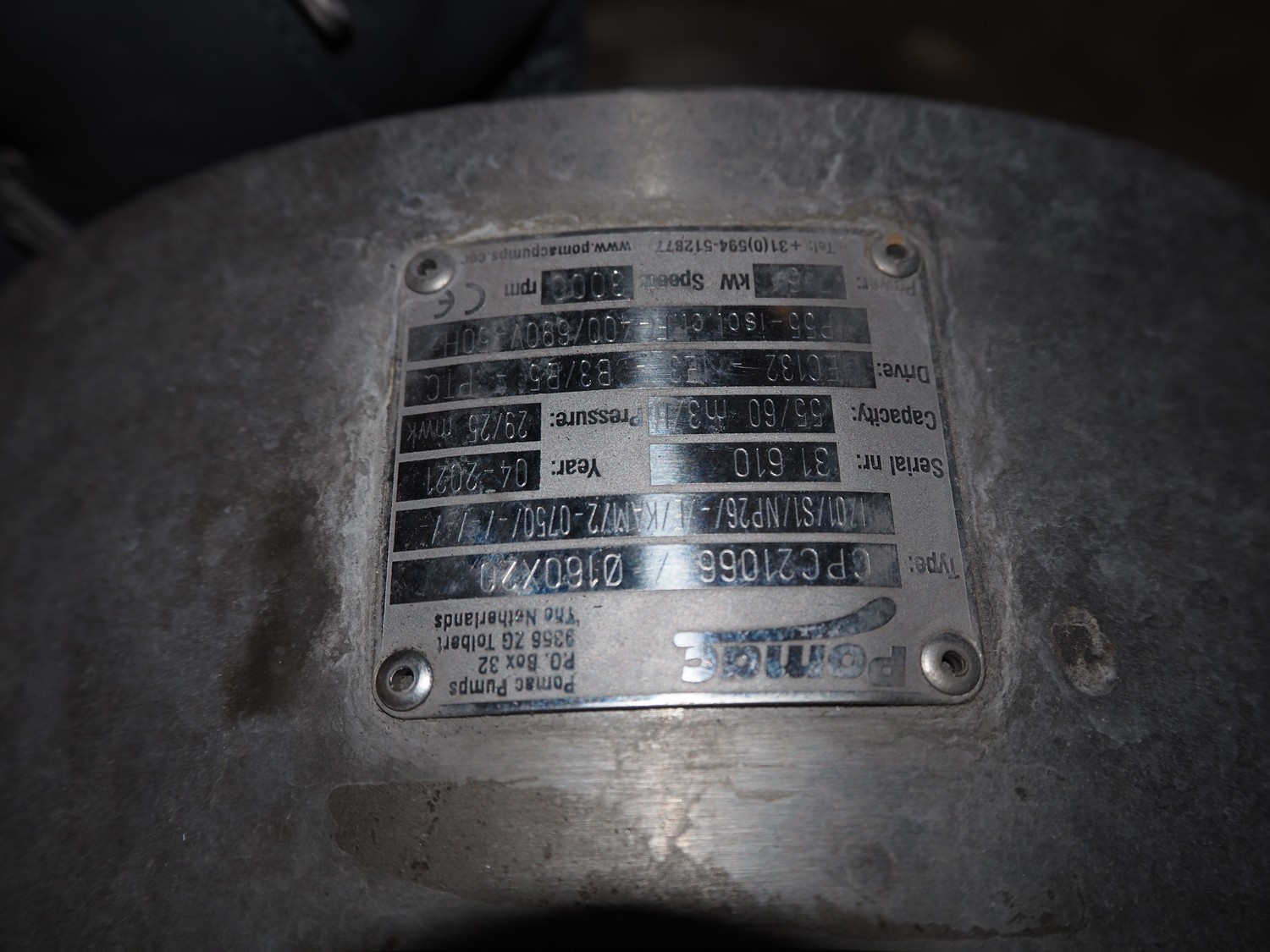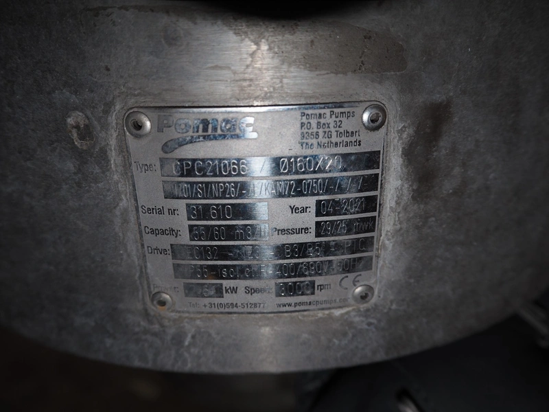 Pomac centrifugal pump, type: CPC21066 / Ø 160x20, serial number: 31 610, year of construction: 04/2021, power: 2.5 kW, 3000 rpm, capacity: 55/60 m³/h, dimensions: 700 mm x 300 mm x 500 mm.