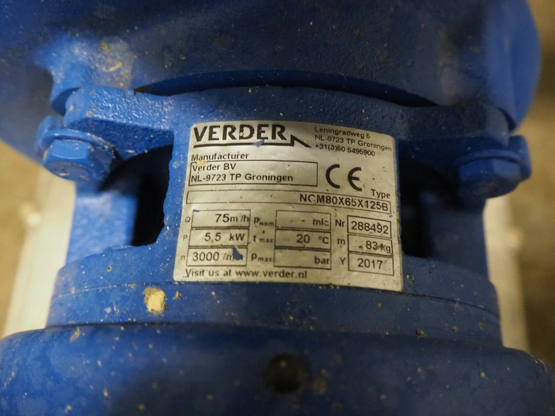 Verder centrifugal pump, type: NCM80X65X125B, number: 288492, year of construction: 2017, power: 5.5 kW, capacity: 75 m³/h, dimensions: 600 mm x 400 mm x 550 mm.