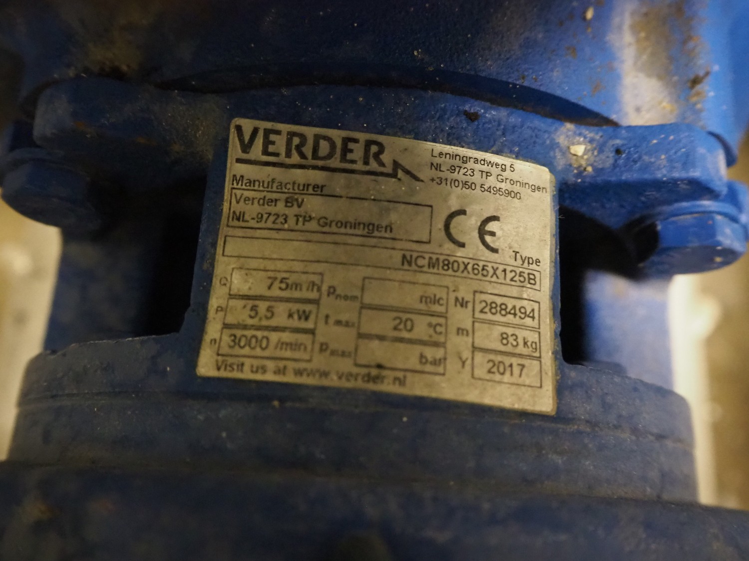 Verder centrifugal pump, type: NCM80X65X125B, number: 288494, year of construction: 2017, power: 5.5 kW, capacity: 75 m³/h, dimensions: 600 mm x 400 mm x 550 mm.