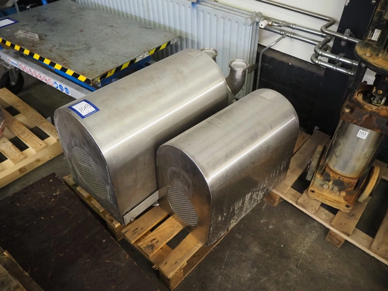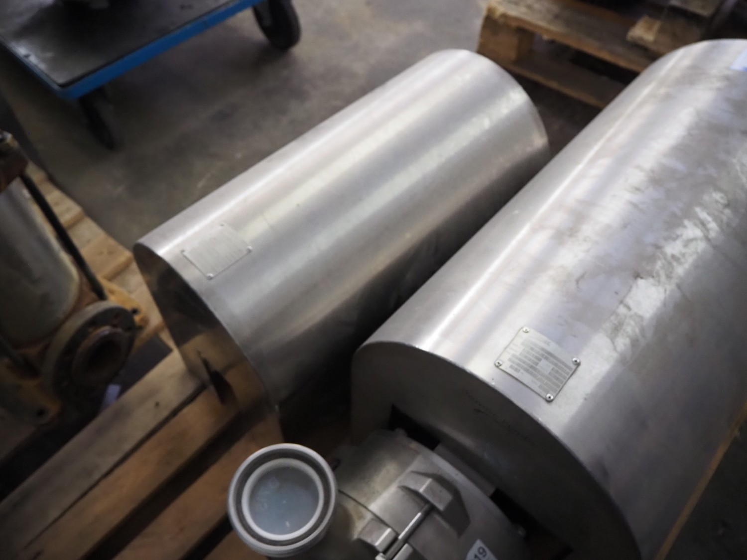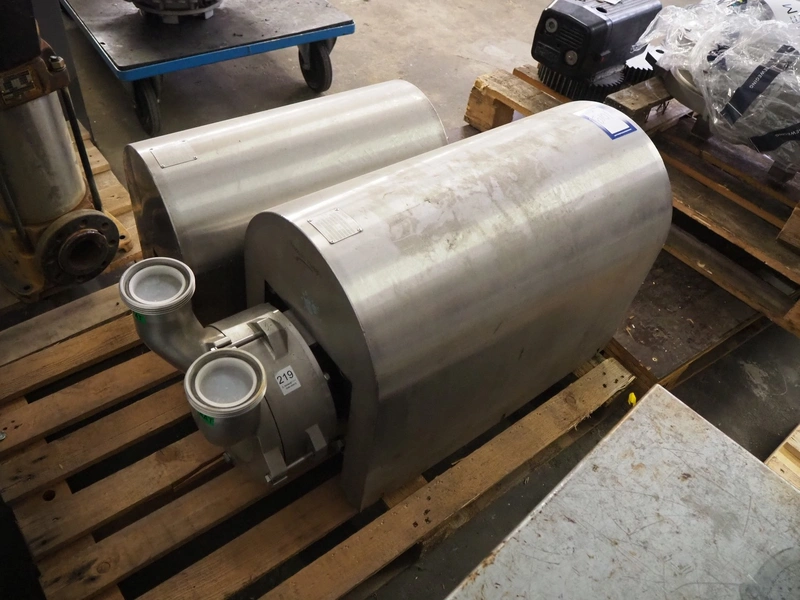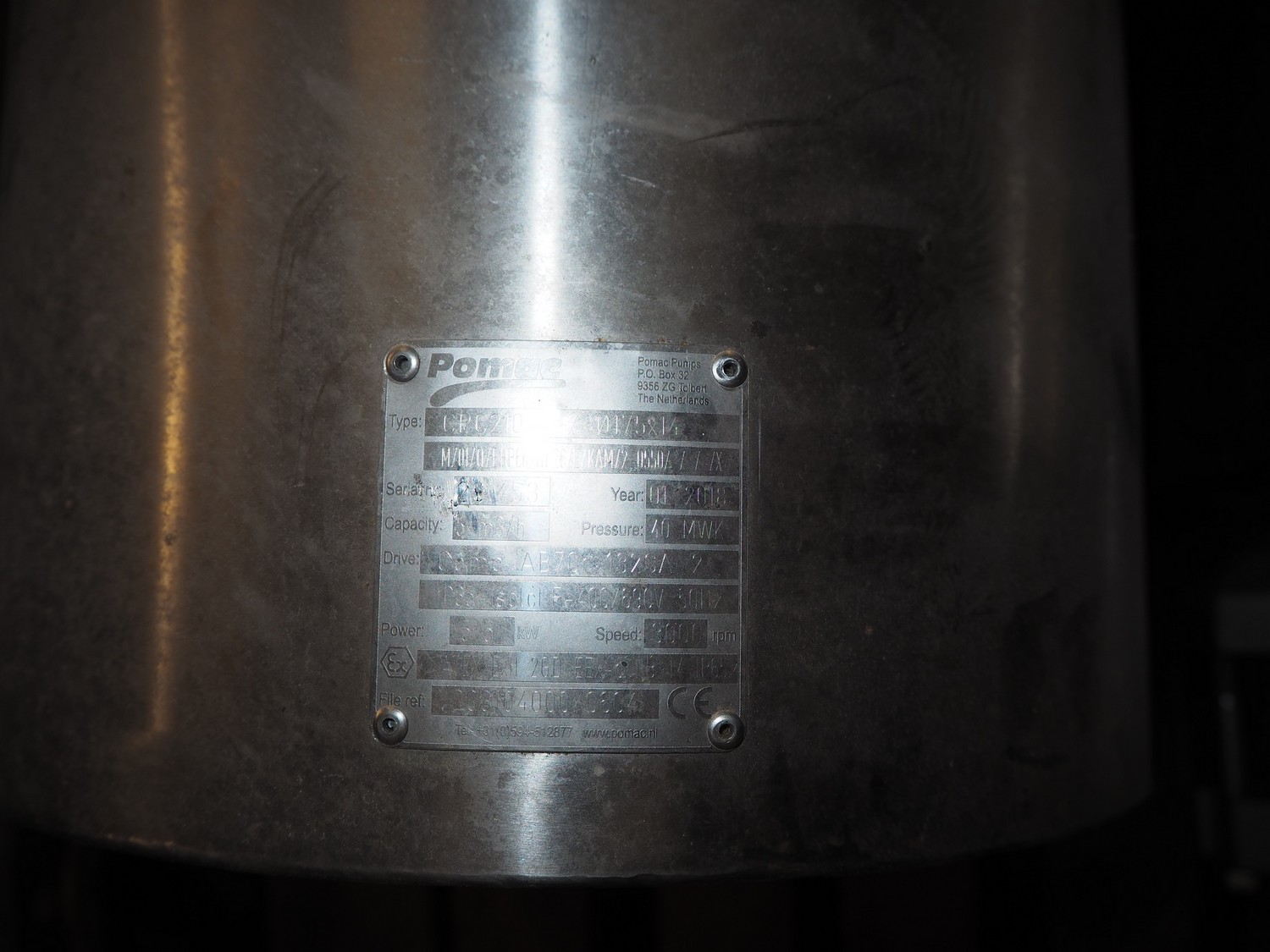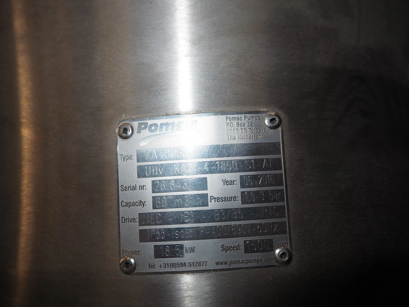 Pallet with Pomac centrifugal pump and s/s pump cover, pump type: ZA48066, serial number: 26 643, year of construction: 06.2016, power: 18.5 kW, capacity: 60 m³/h, dimensions: 550 mm x 400 mm x 550 mm.