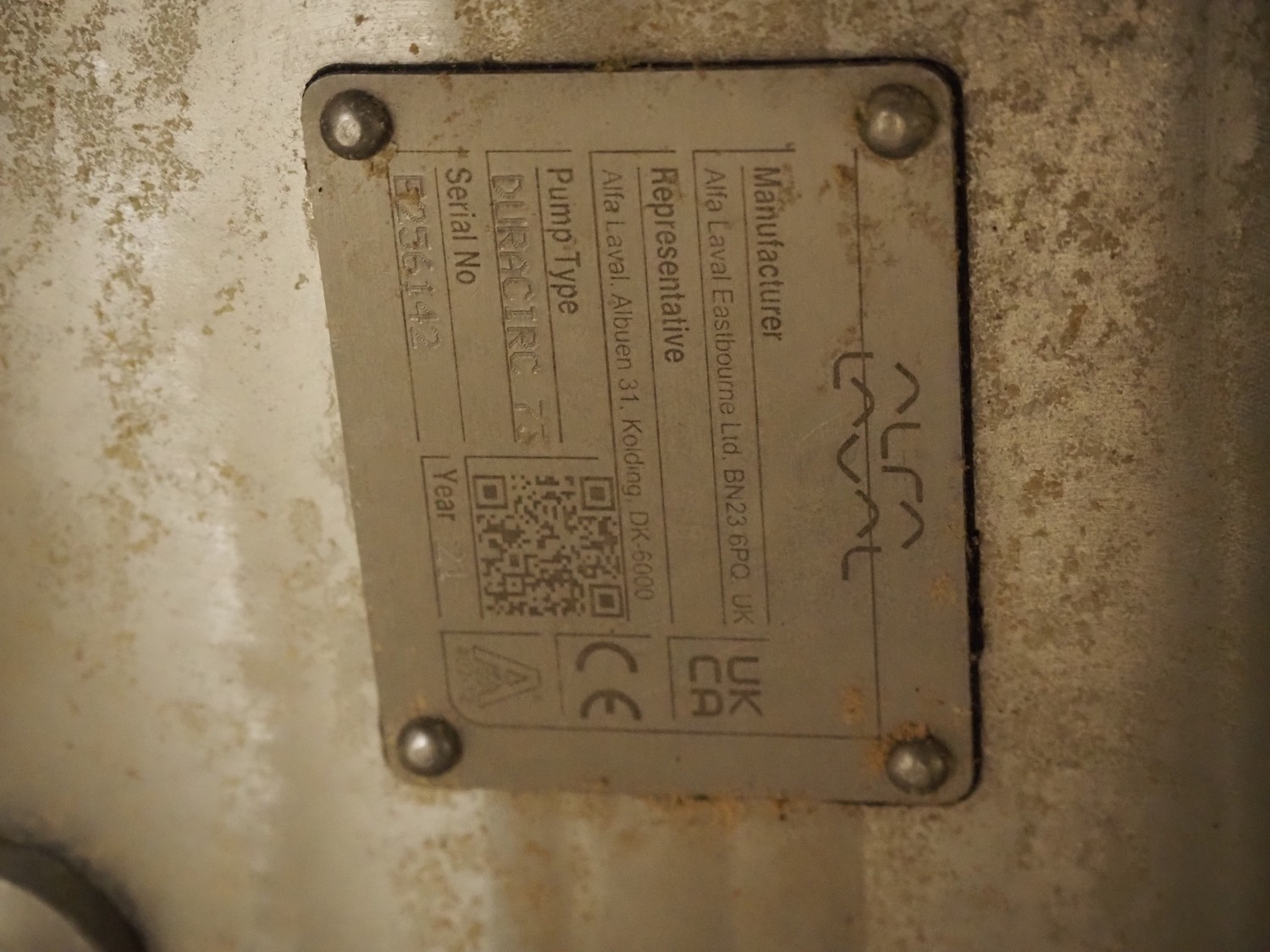 Alfa Laval circumferential piston pump, pump type: DURACIRC 73, serial number: E256142, year of construction: 2021, dimensions: 1600 mm x 600 mm x 800 mm, including various valves and s/s filter housing.