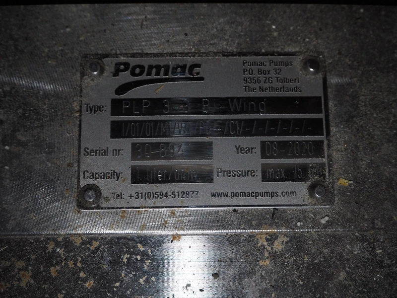 Pomac rotary lobe pump, type: PLP 3-3 BI-Wing, serial number: 30 894, year of construction: 08-2020, power: 3 kW, 15 bar, capacity: 1 litre per rotation, dimensions: 1150 mm x 350 mm x 500 mm.