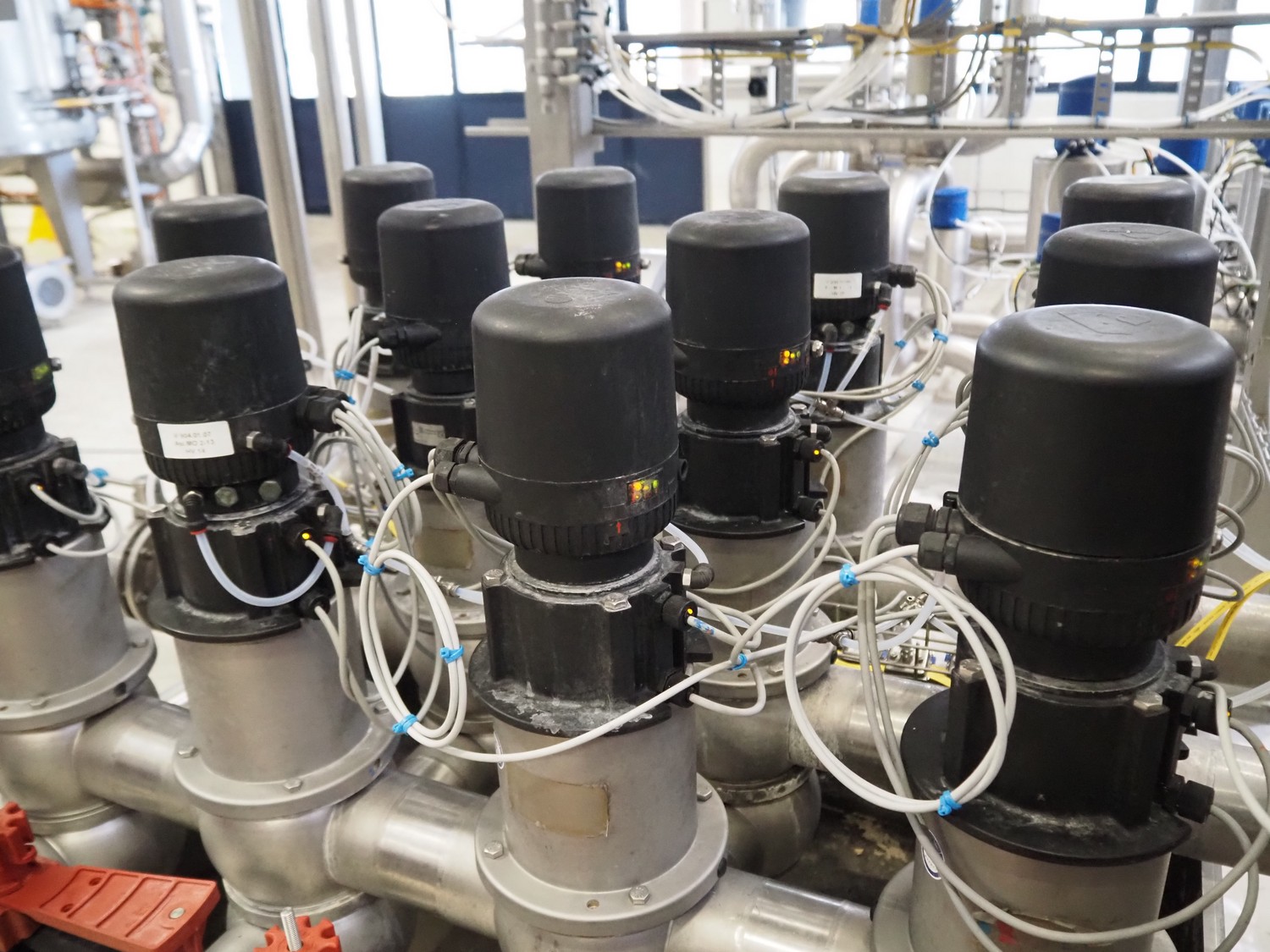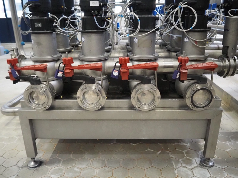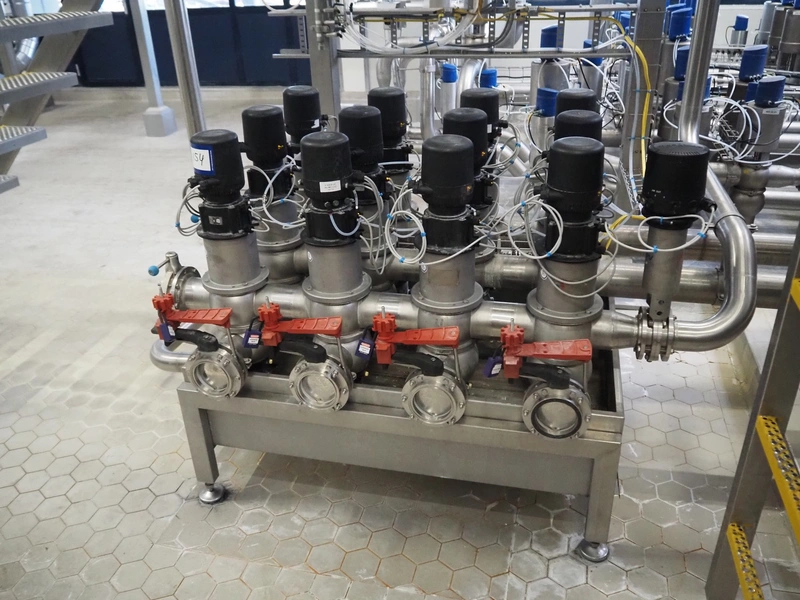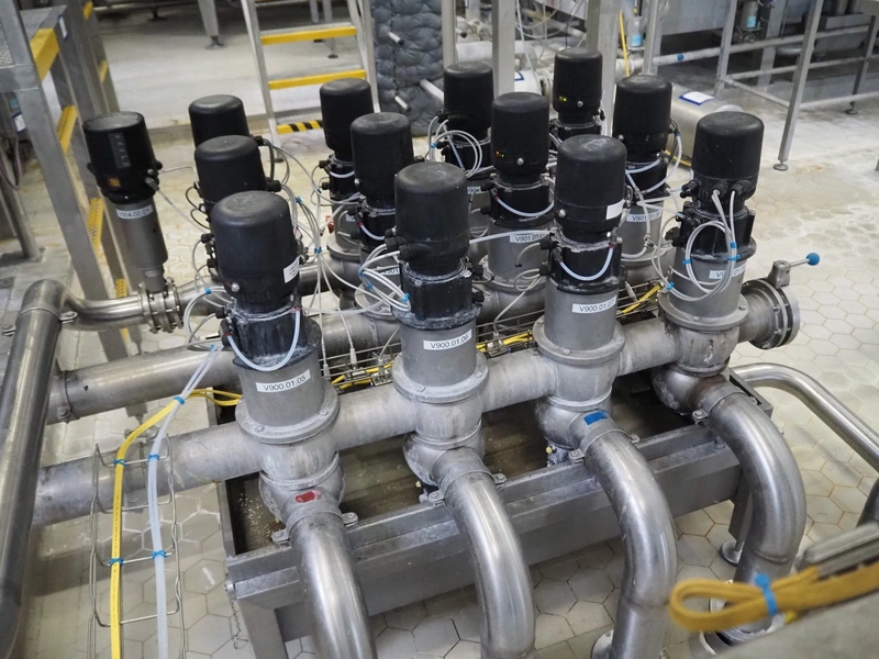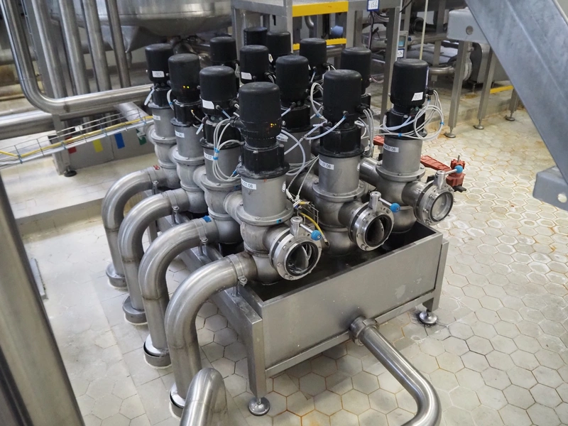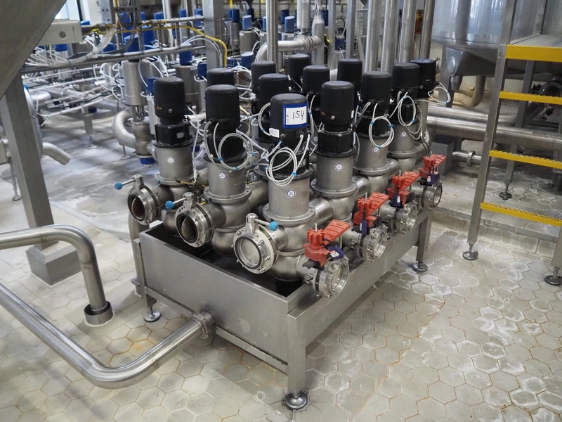 Manifold with 13 APV valves, dimensions: 1450 mm x 1200 mm x 1100 mm.