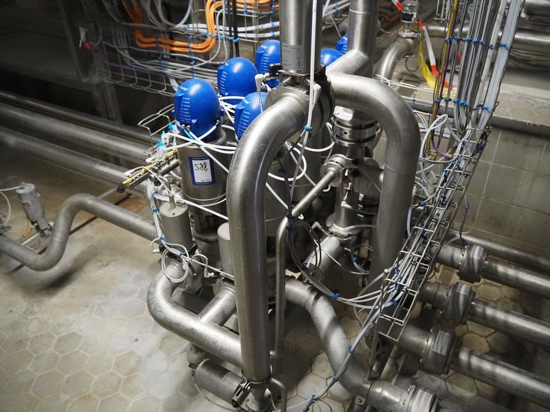 Manifold with 14 Alfa Laval valves and 8 regulators, dimensions: 1050 mm x 1000 mm x 1250 mm.