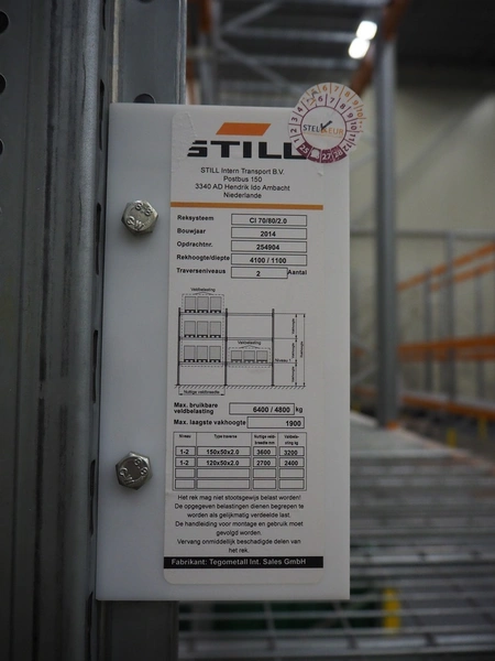 Still steel pallet rack, type: CI 70/80/2.0, number: 254904, year of construction: 2014, consisting of: 12 uprights, dimensions: (12x) 4950 mm x 1100 mm, 40 beams, length: 2750 mm.