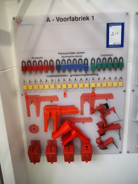 Lock-in / lock-out station, consisting of: 2 wall mounted boards with various locks, dimensions: 950 mm x 1300 mm and 650 mm x 1300 mm.