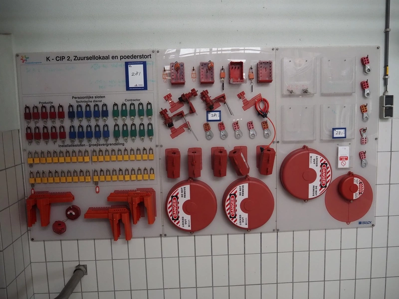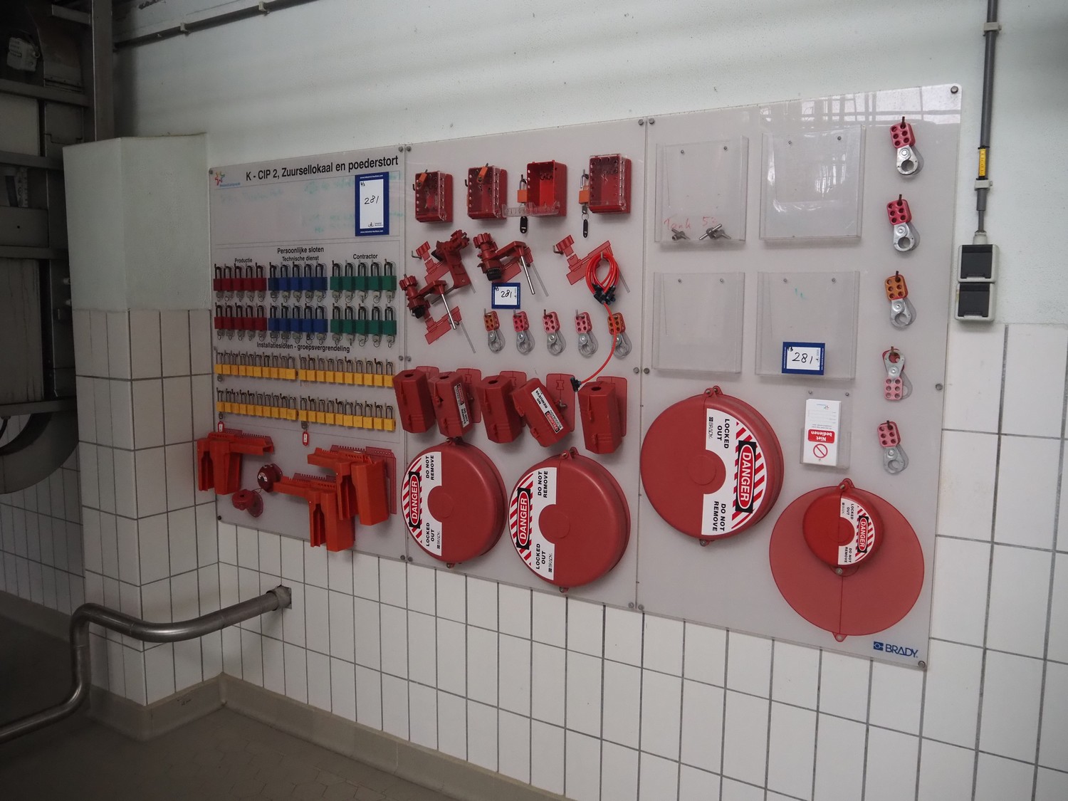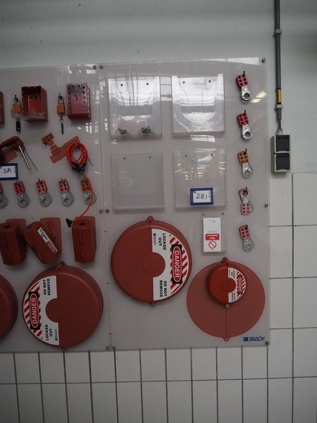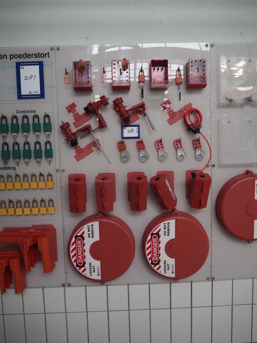 Lock-in / lock-out station, consisting of: 3 wall mounted boards with various locks, dimensions: 650 mm x 1320 mm, 750 mm x 1320 mm and 820 mm x 1320 mm.