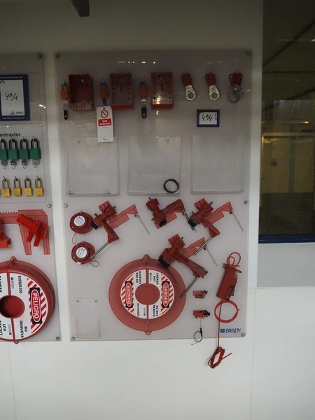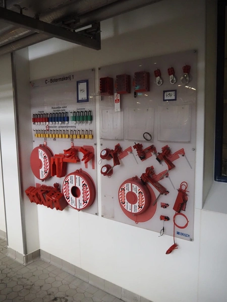 Lock-in / lock-out station, consisting of: 2 wall mounted boards with various locks, dimensions: 950 mm x 1320 mm and 850 mm x 1320 mm.