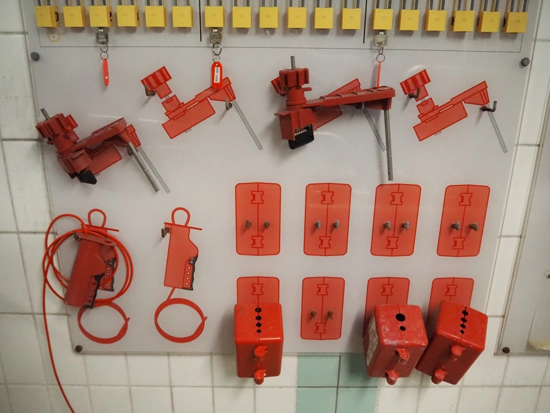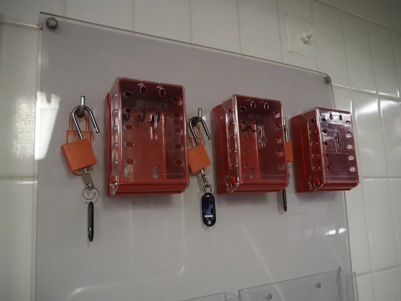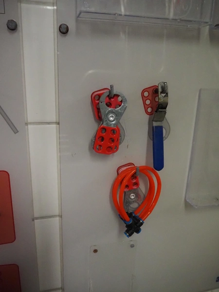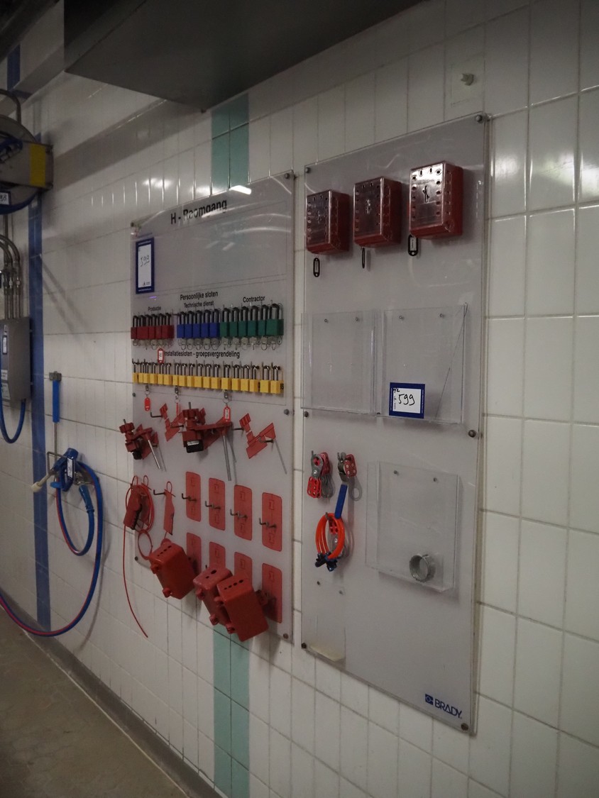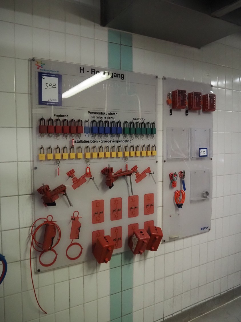 Lock-in / lock-out station, consisting of: 2 wall mounted boards with various locks, dimensions: 950 mm x 1300 mm and 560 mm x 1300 mm.