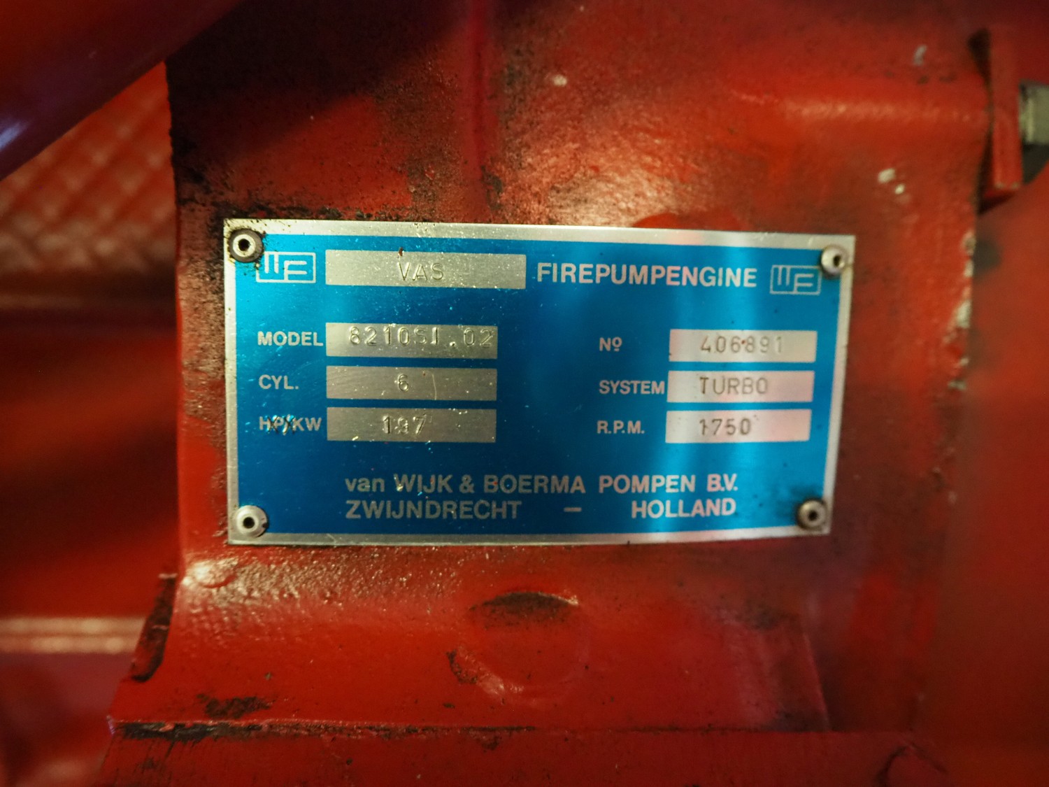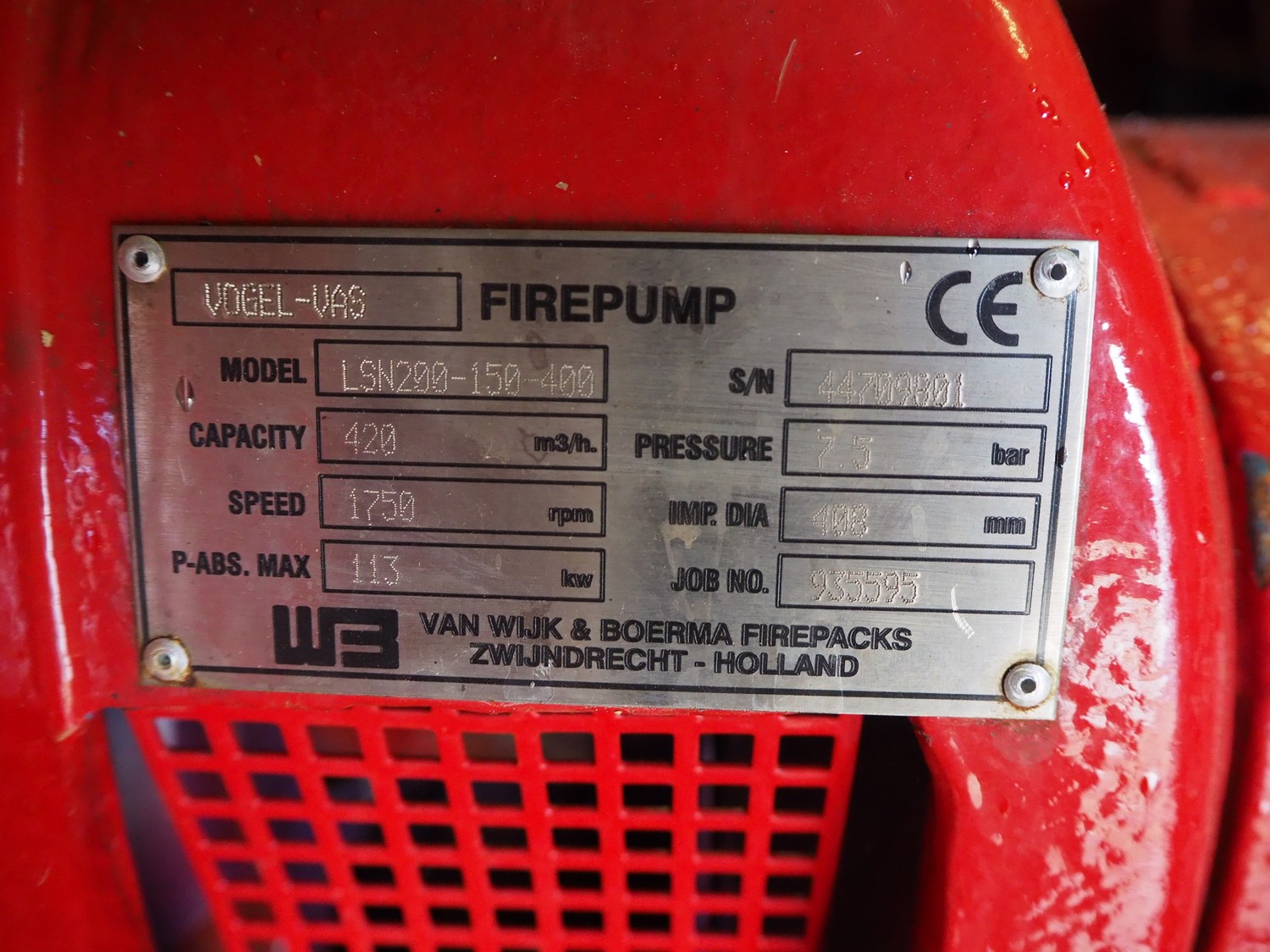 Van Wijk & Boerma sprinkler pump, model pump: LSN200-150-400, serial number: 44709601, 113 kW, speed: 1750 rpm, capacity: 420 m³/h, model engine: 8210SI.02, number: 406891, system: TURBO, 220 V, 50 Hz, power: 107 kW, fuel: Diesel, dimensions: 4000 mm x 1000 mm x 1800 mm. Please notice that the pump will be available at the end of the project in December 2025.