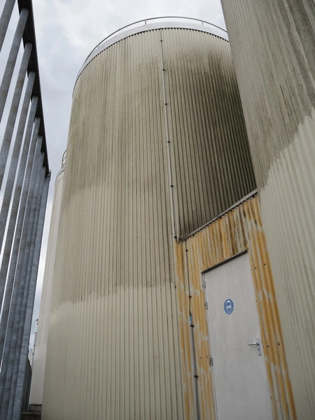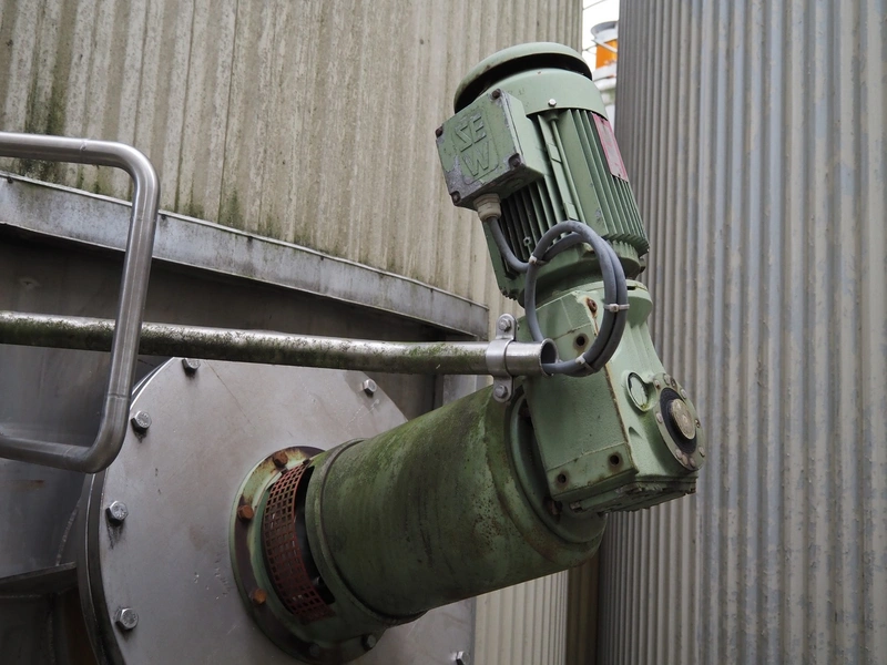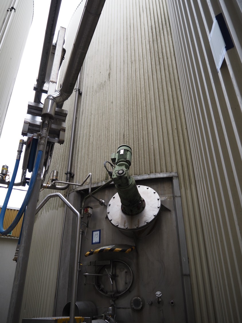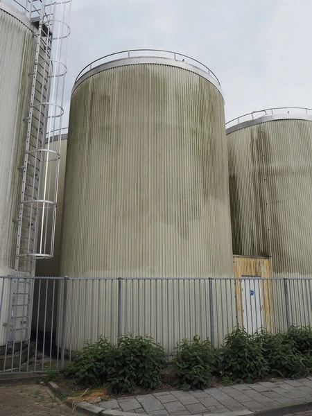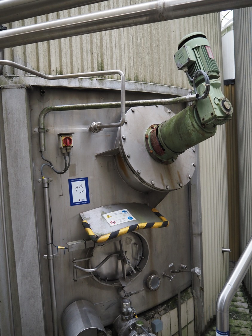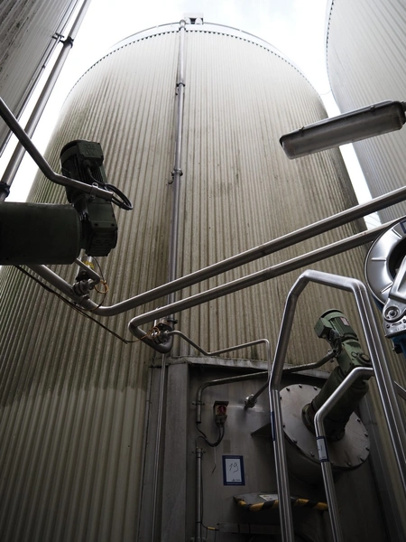 Insulated s/s tank with Veenstra b.v. mixer used for raw milk reception, volume: approximately 200.000 litres, diameter: 5800 mm, height: 9750 mm.