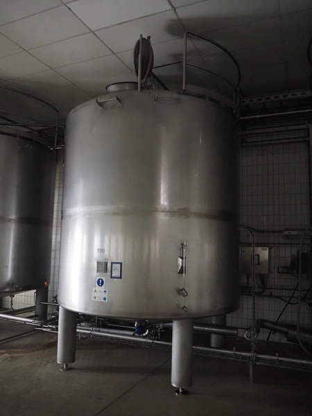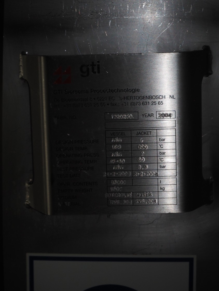 GTI Siersema Procestechnologie s/s double jacketed tank with mixer, factory number: 1320230, year of construction: 2004, volume: 15000 litres, design temperature: 100 °C, operating temperature: 40-60 °C, empty weight: 1500 kg, dimensions: Ø 2800 mm x 4600 mm.