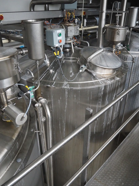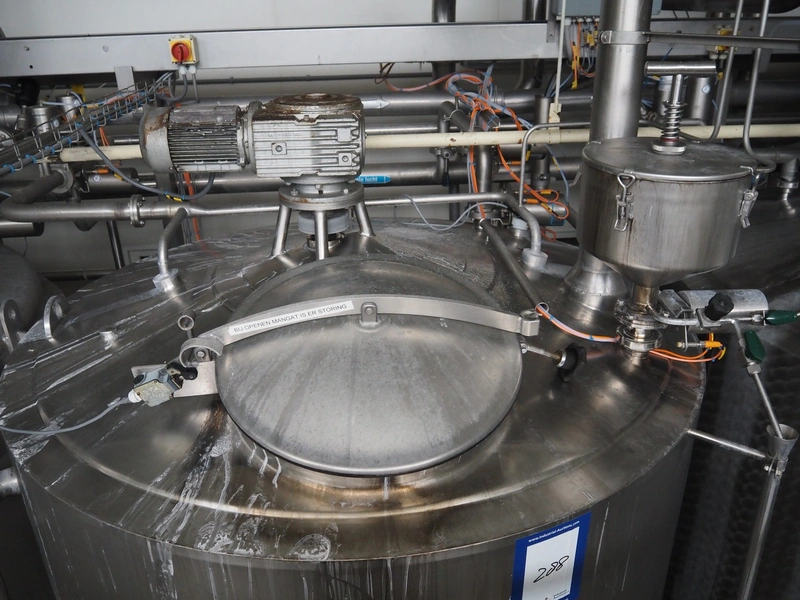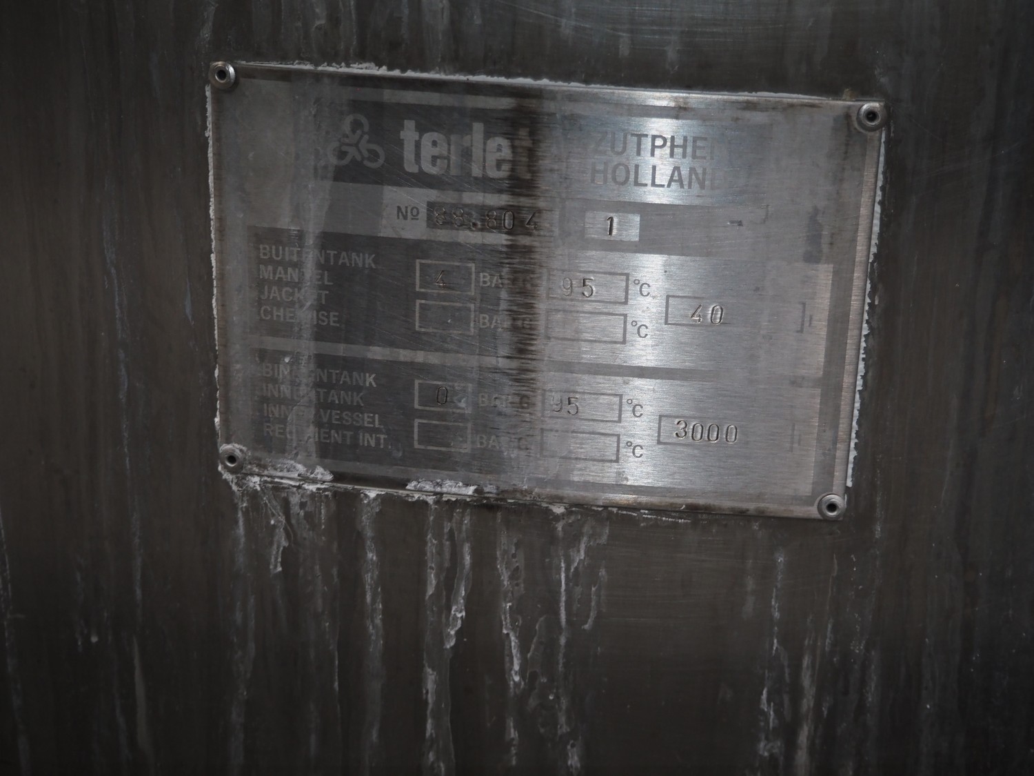 Terlet s/s double jacketed tank with agitator, number: 88.804 1, volume: 3000 litres, maximum operating temperature: 95 °C, maximum operating pressure: 4 bar, dimensions: Ø 1800 mm x 3200 mm.