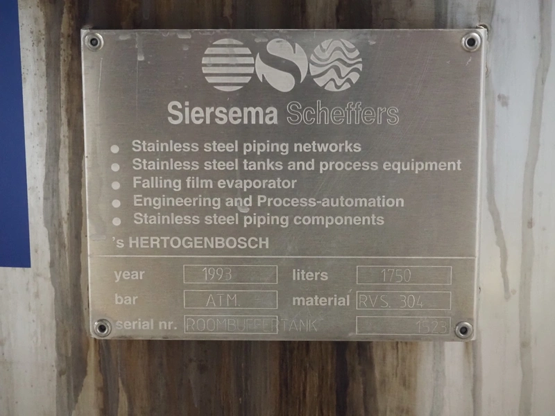 Siersema Scheffers s/s tank with agitator, type: ROOMBUFFERTANK, serial number: 1523, year of construction: 1993, capacity: 1750 litres, dimensions: 1400 mm x 1400 mm x 2700 mm.