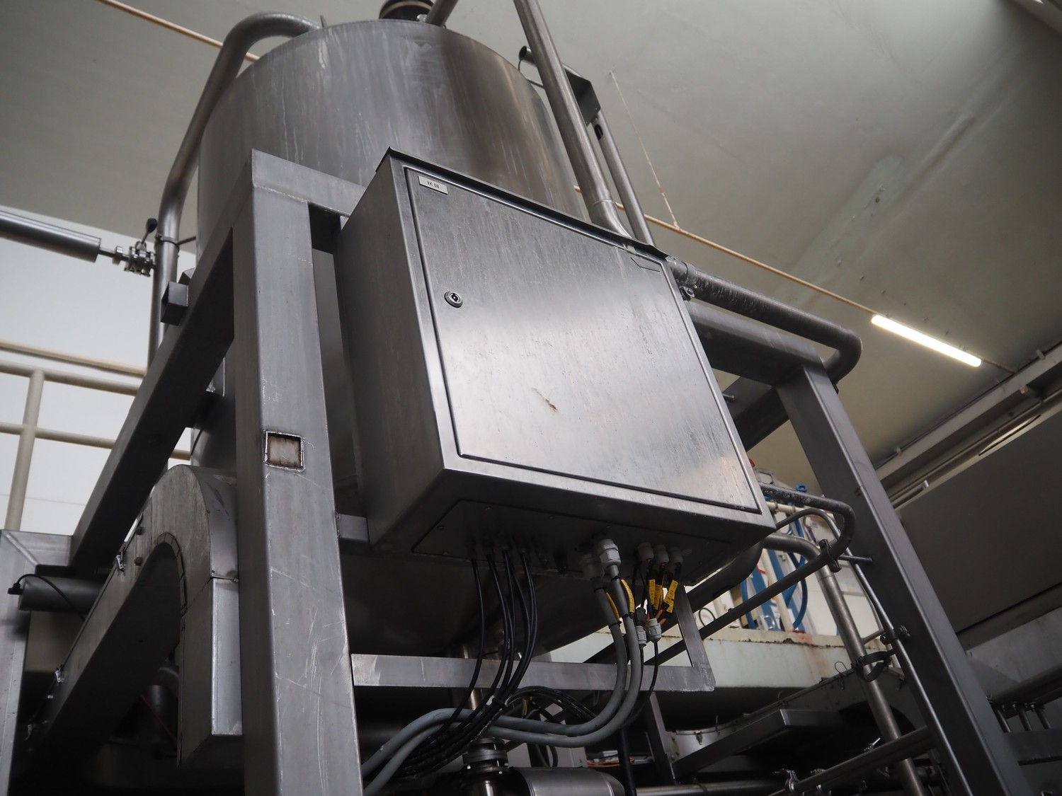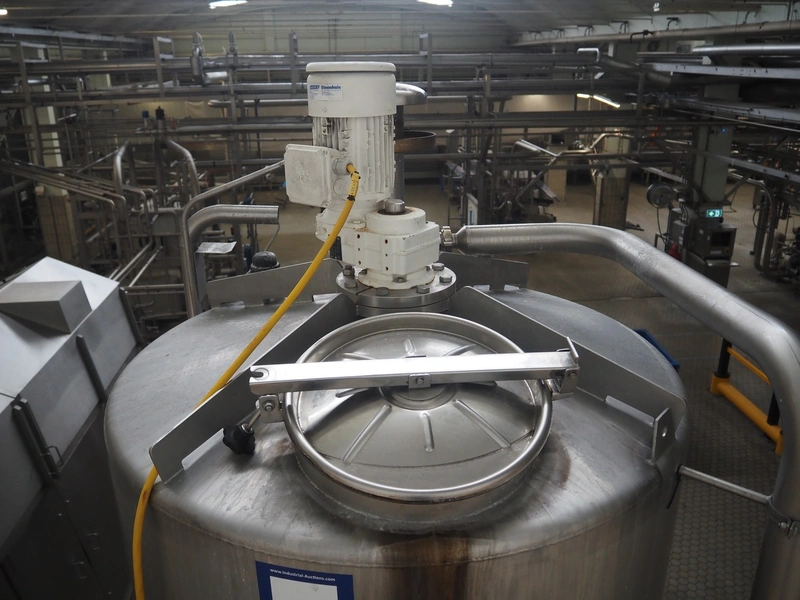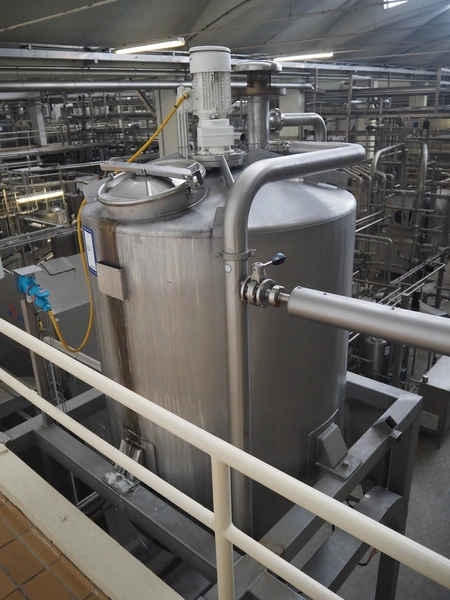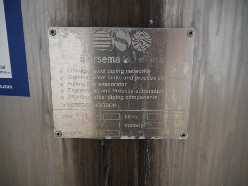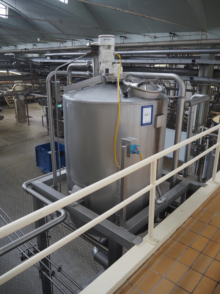 Siersema Scheffers s/s tank with agitator on s/s frame, model: ROOMBUFFERTANK, number: 1523, year of construction: 1993, capacity: 1750 litres, dimensions: 1350 mm x 1350 mm x 2650 mm.