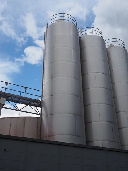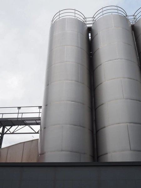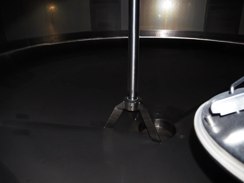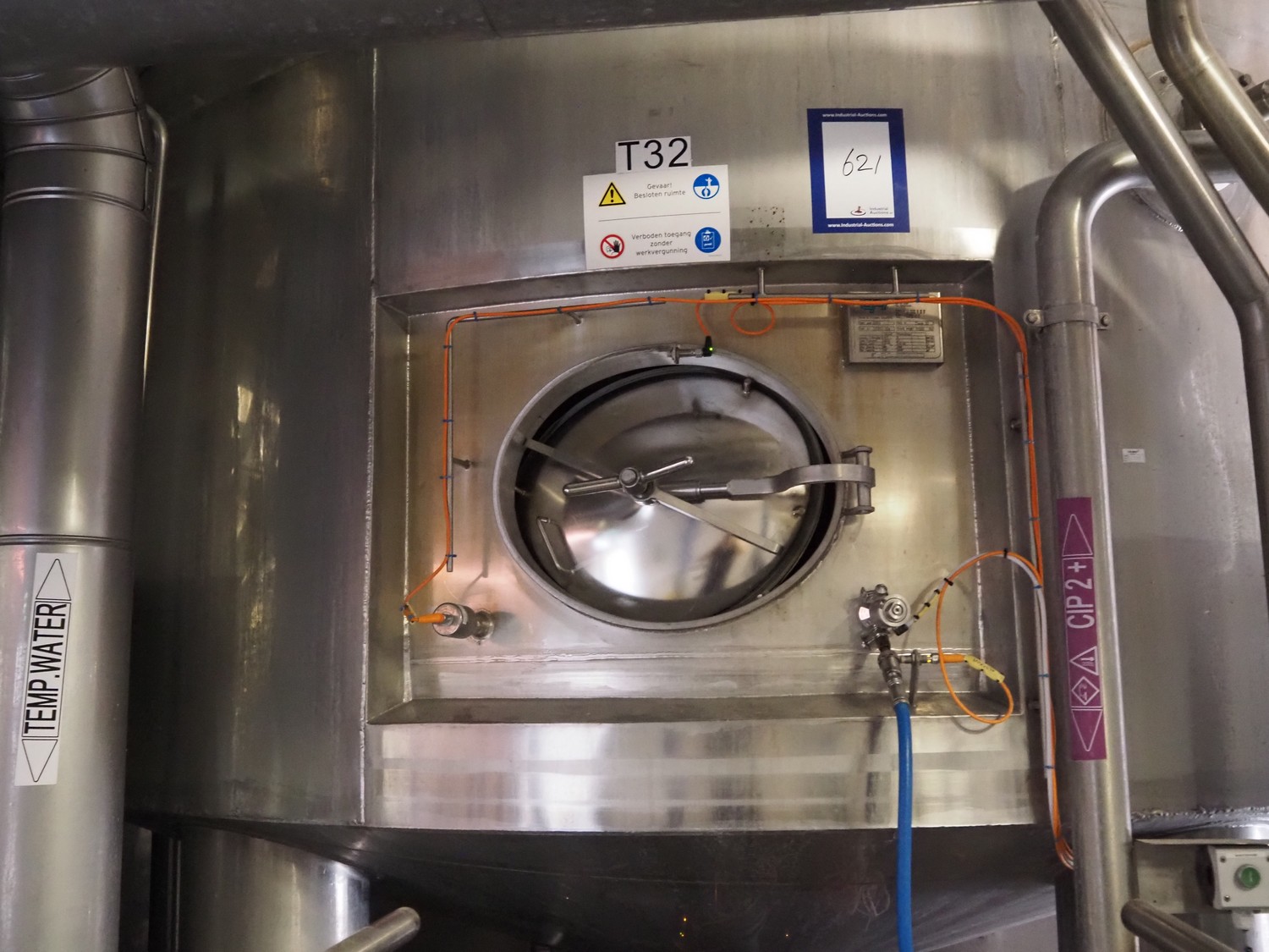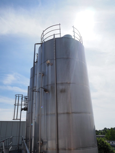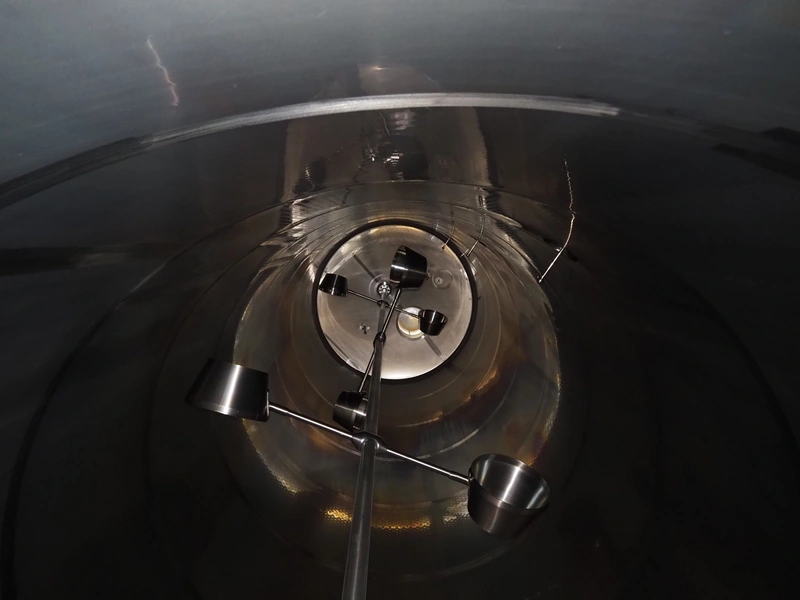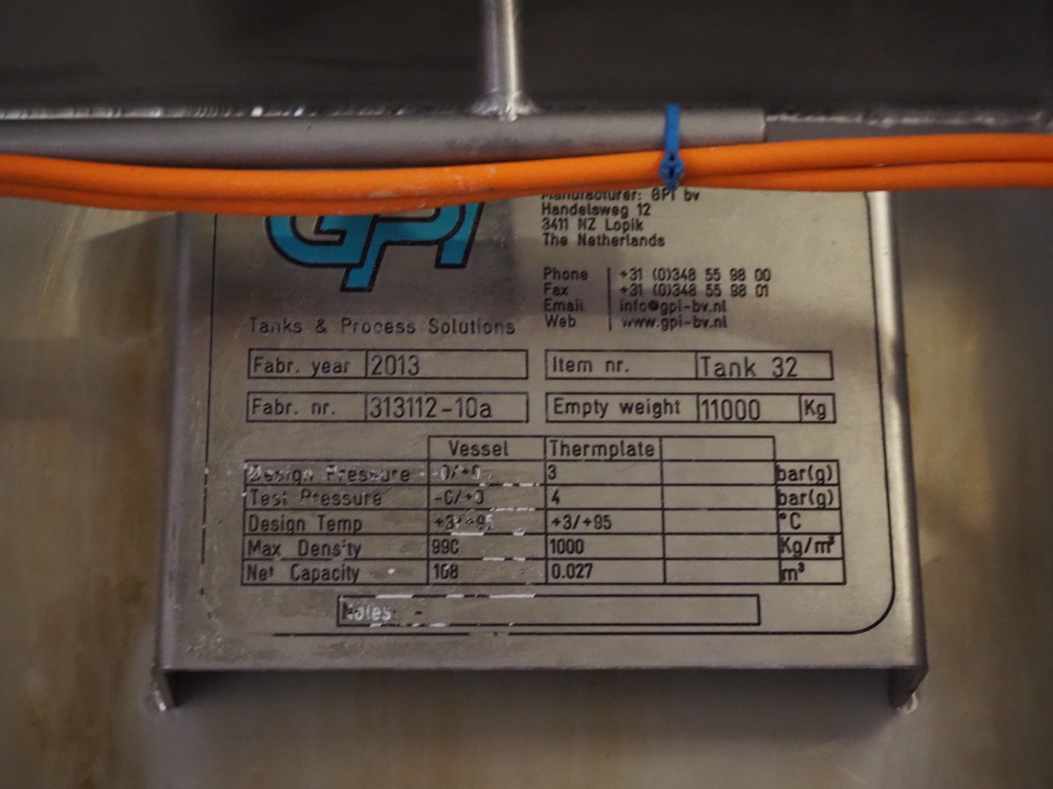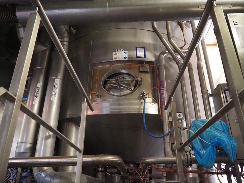 GPI s/s double jacketed tank with agitator, fabrication number: 313112-10a, year of construction: 2013, empty weight: 11000 kg, capacity: 108 m³, temperature range: +3/+95°C, dimensions: Ø 3300 mm x 15500 mm.