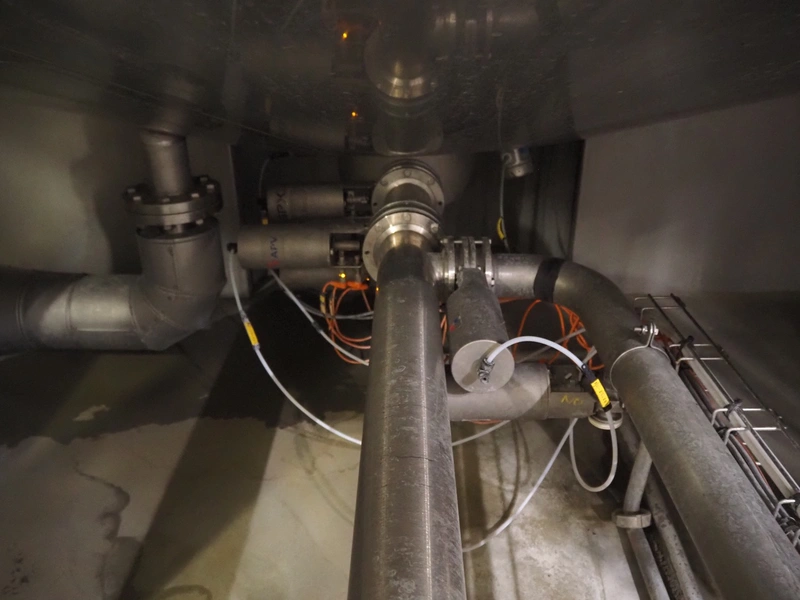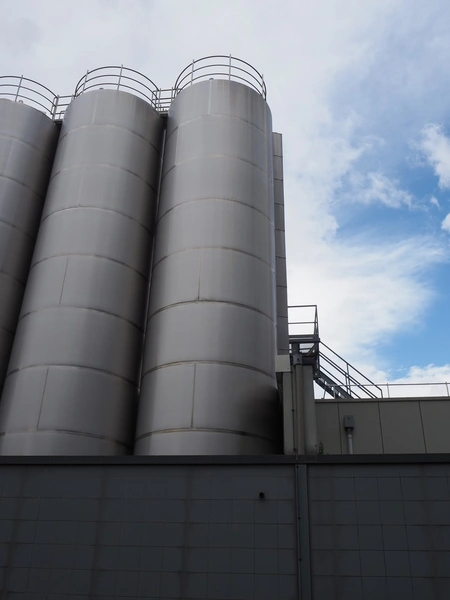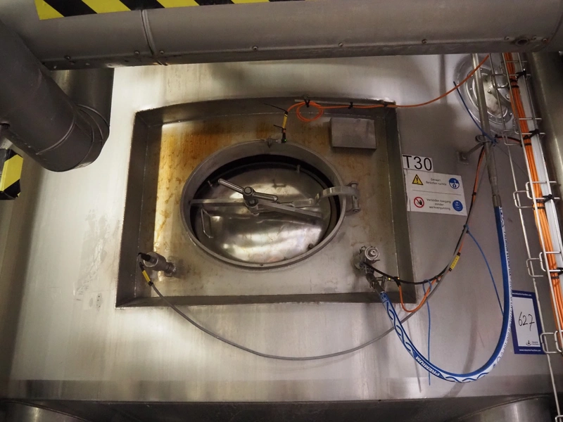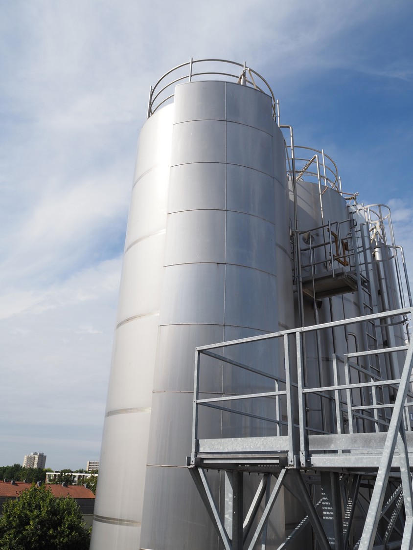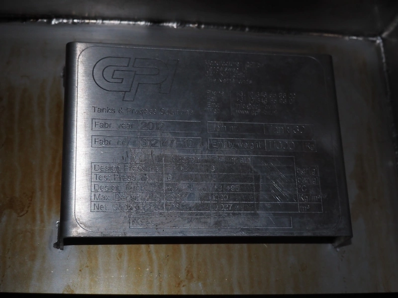 GPI s/s double jacketed tank with agitator, fabrication number: 312147-10, year of construction: 2012, empty weight: 11000 kg, capacity: 108 m³, temperature range: +3/+95°C, dimensions: Ø 3300 mm x 15500 mm.