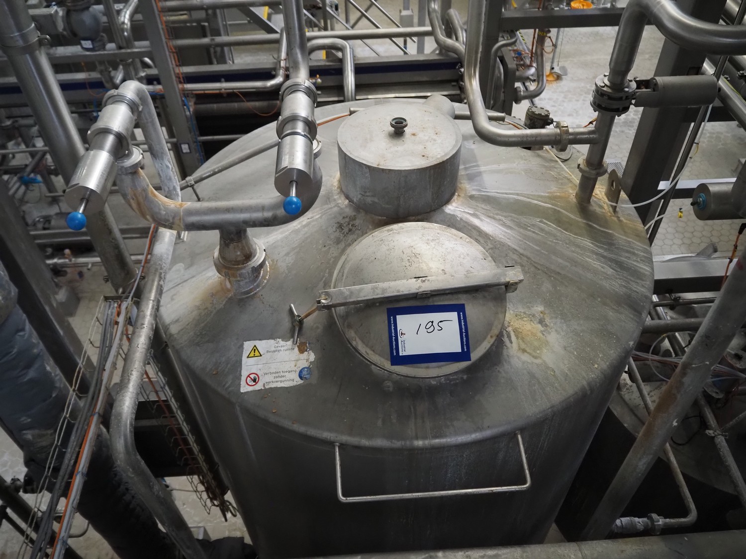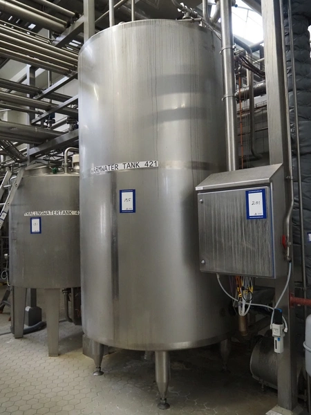 Tankbau Gruss GmbH s/s double jacketed tank, serial number: 396/03, year of construction: 2003, volume: 4250 litres, maximum operating temperature: 95 °C, dimensions: Ø 1600 mm x 3800 mm.