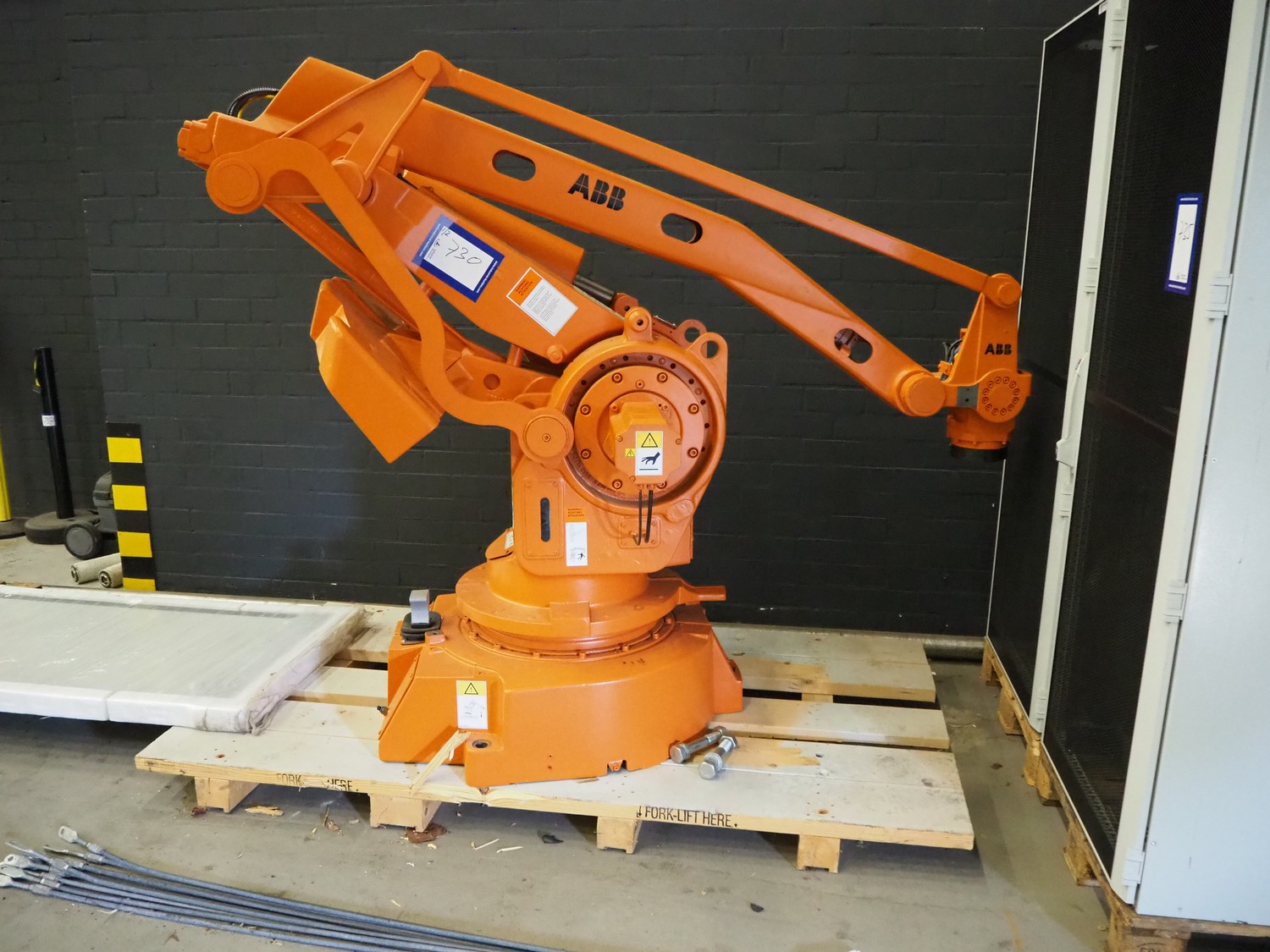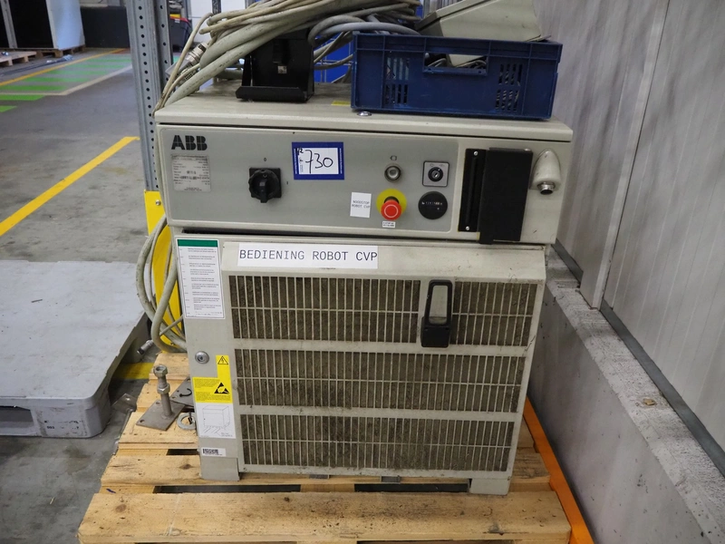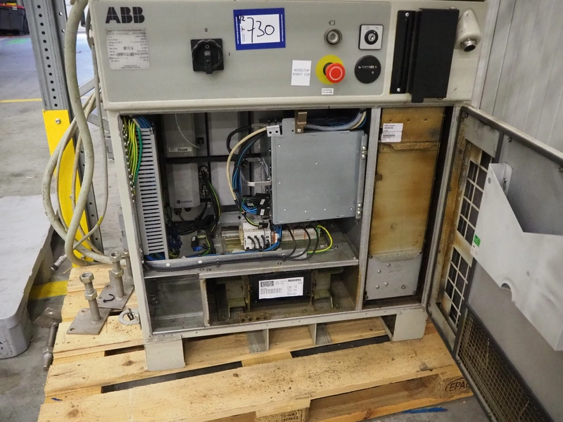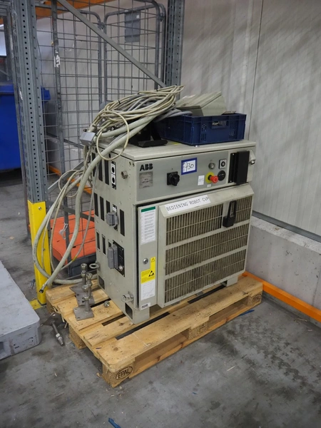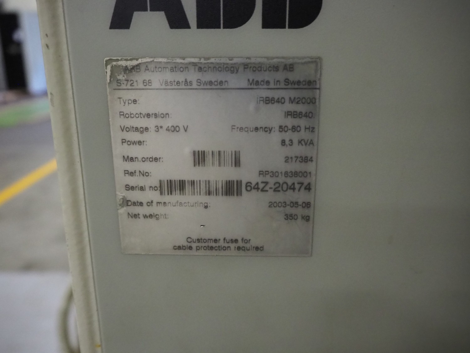 ABB industrial robot, type: IRB640 M2000, serial number: 64Z-20331, year of construction: 2018/12/12, weight: 1950 kg, dimensions: 2100 mm x 1100 mm x 1900 mm, with control box, type: IRB640 M2000, serial number: 64Z-20474, year of construction: 2003/05/06, weight: 350 kg, dimensions: 800 mm x 500 mm x 950 mm.