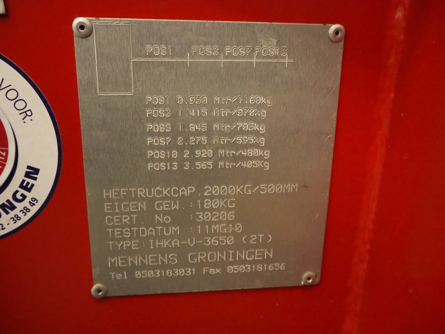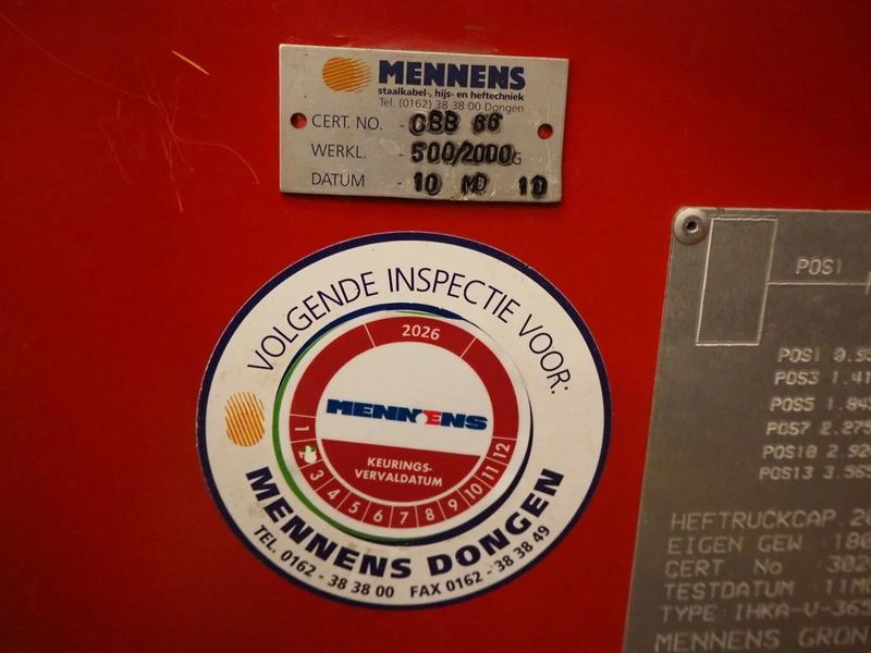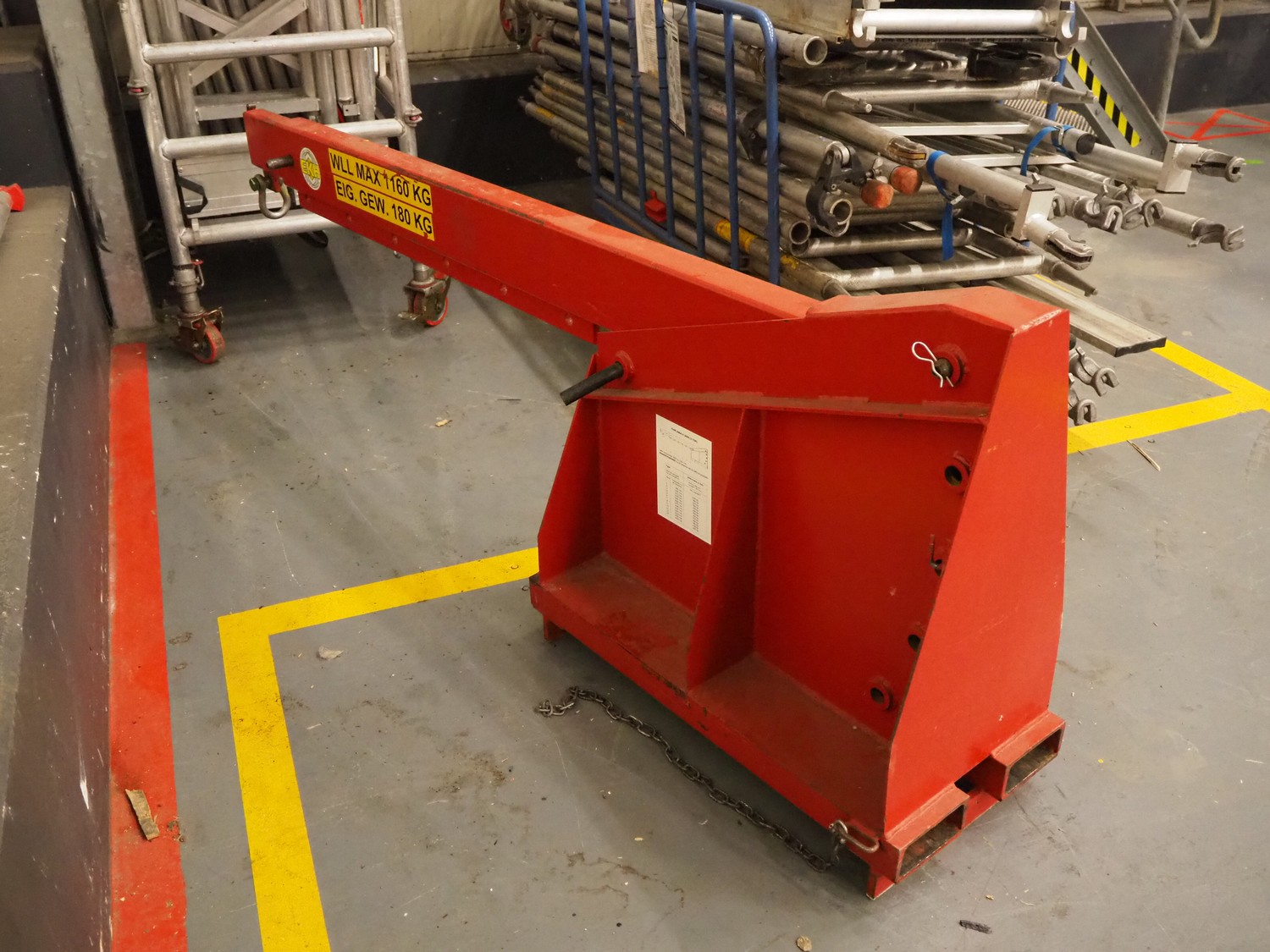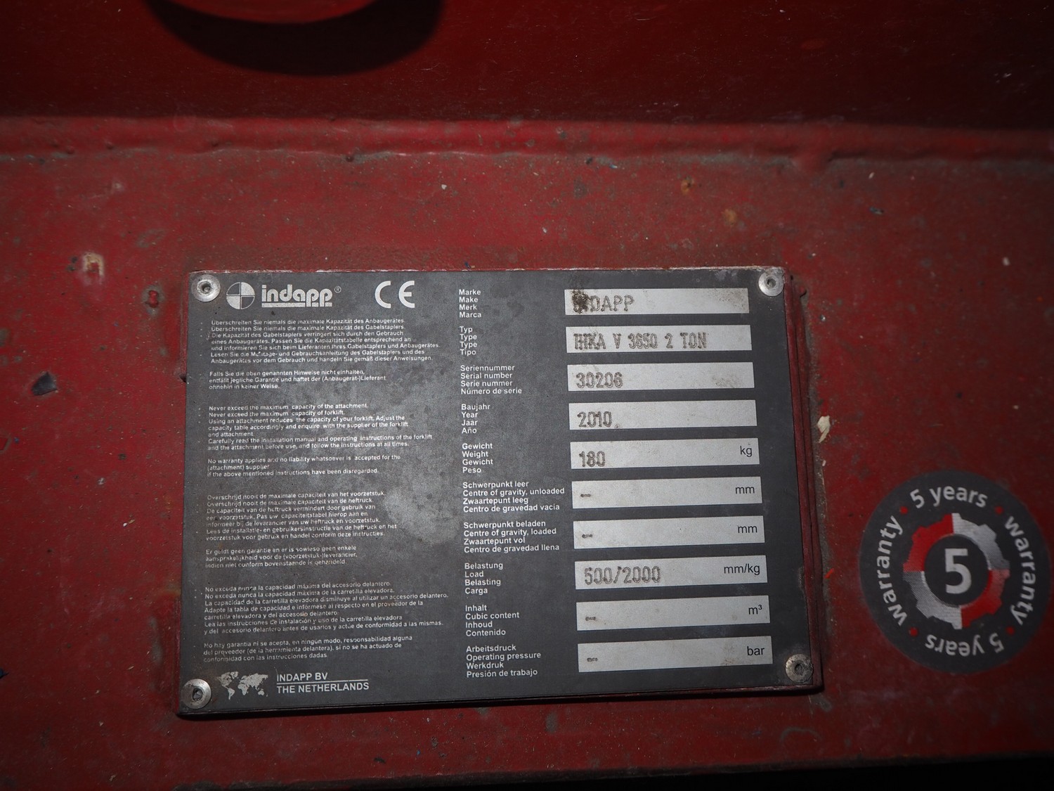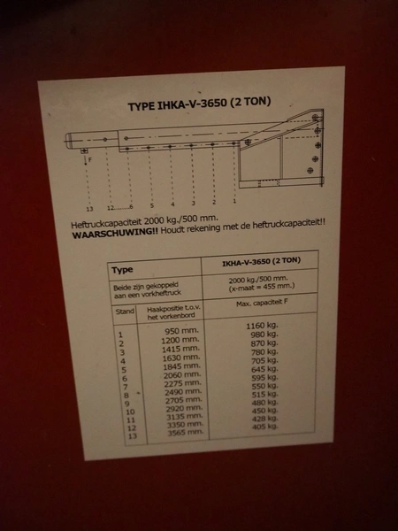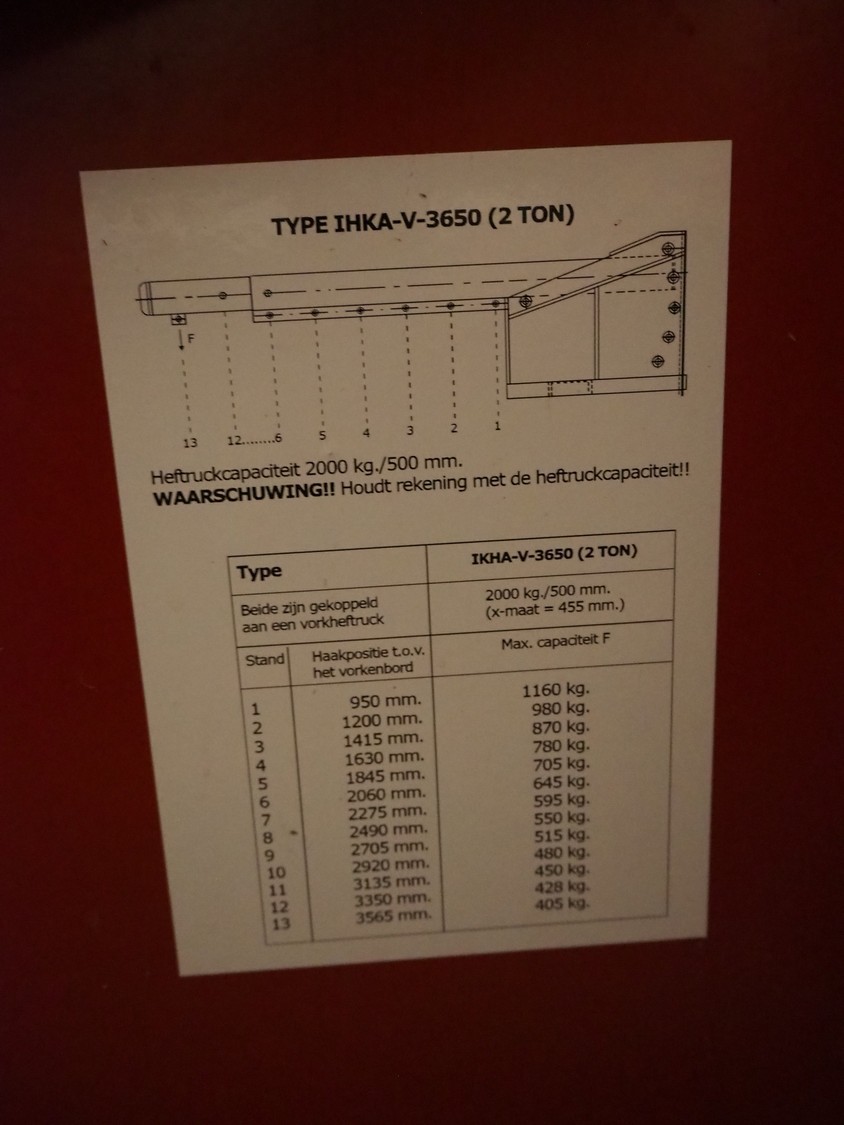 Indapp crane arm forklift attachment, type: HIKA V 3650 2 TON, serial number: 30206, year of construction: 2010, capacity: 2000 kg, dimensions: 2300 mm x 400 mm x 860 mm.