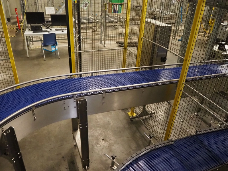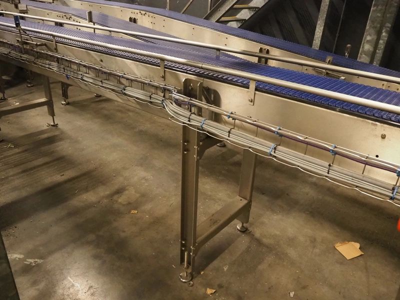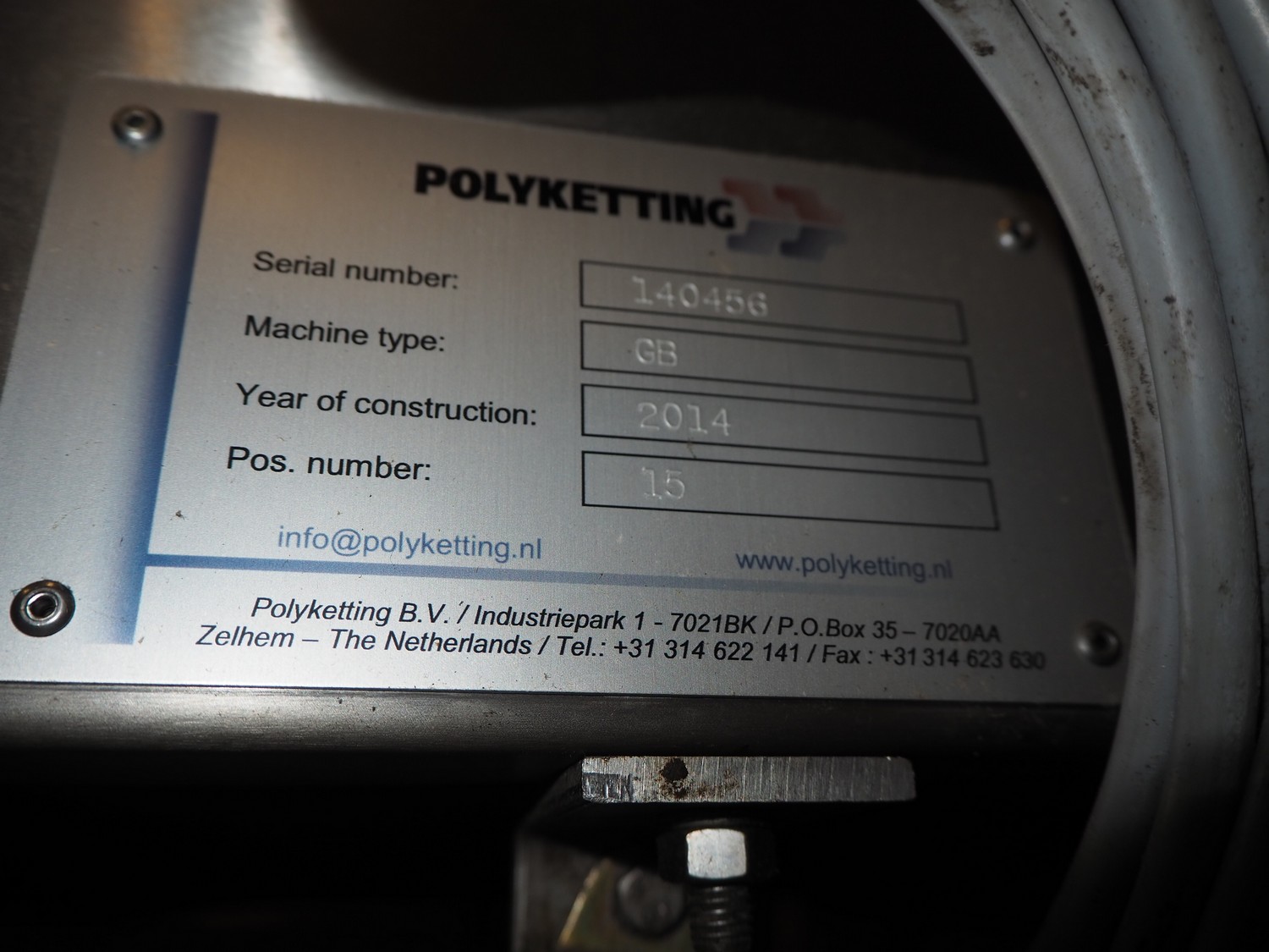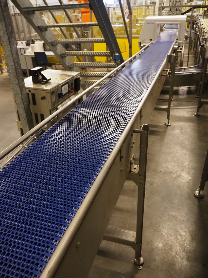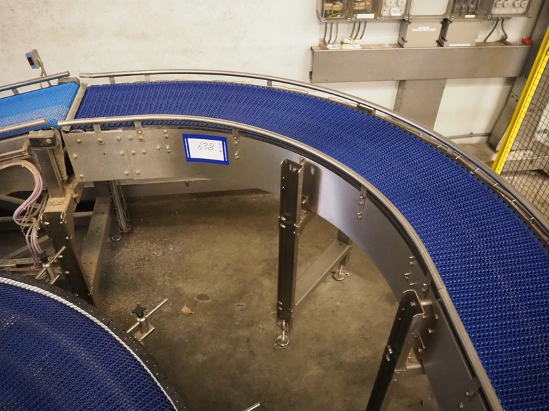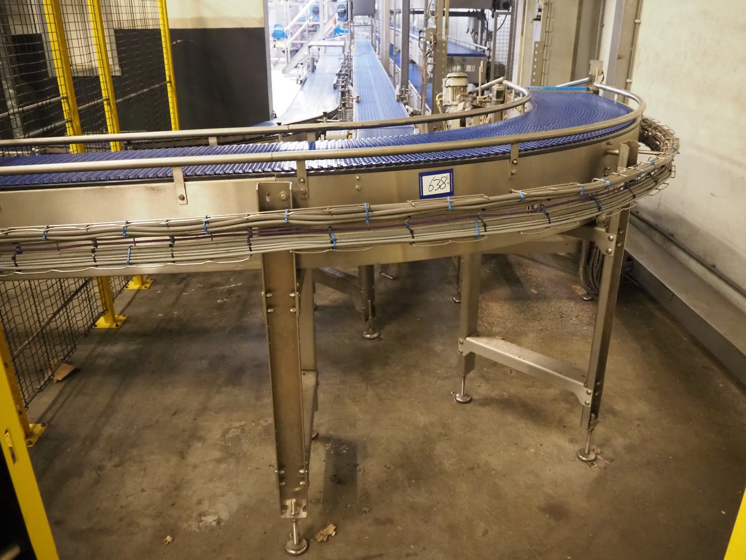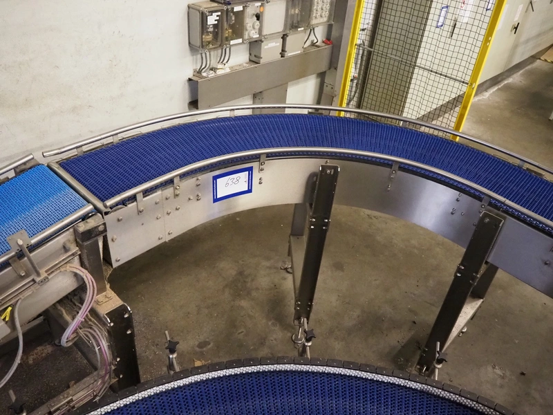 Polyketting 90° curve conveyor, type: GB, serial number: 140456, year of construction: 2014, s/s frame, plastic mesh belt, belt width: 405 mm, total dimensions: 8200 mm x 1750 mm x 1350 mm.