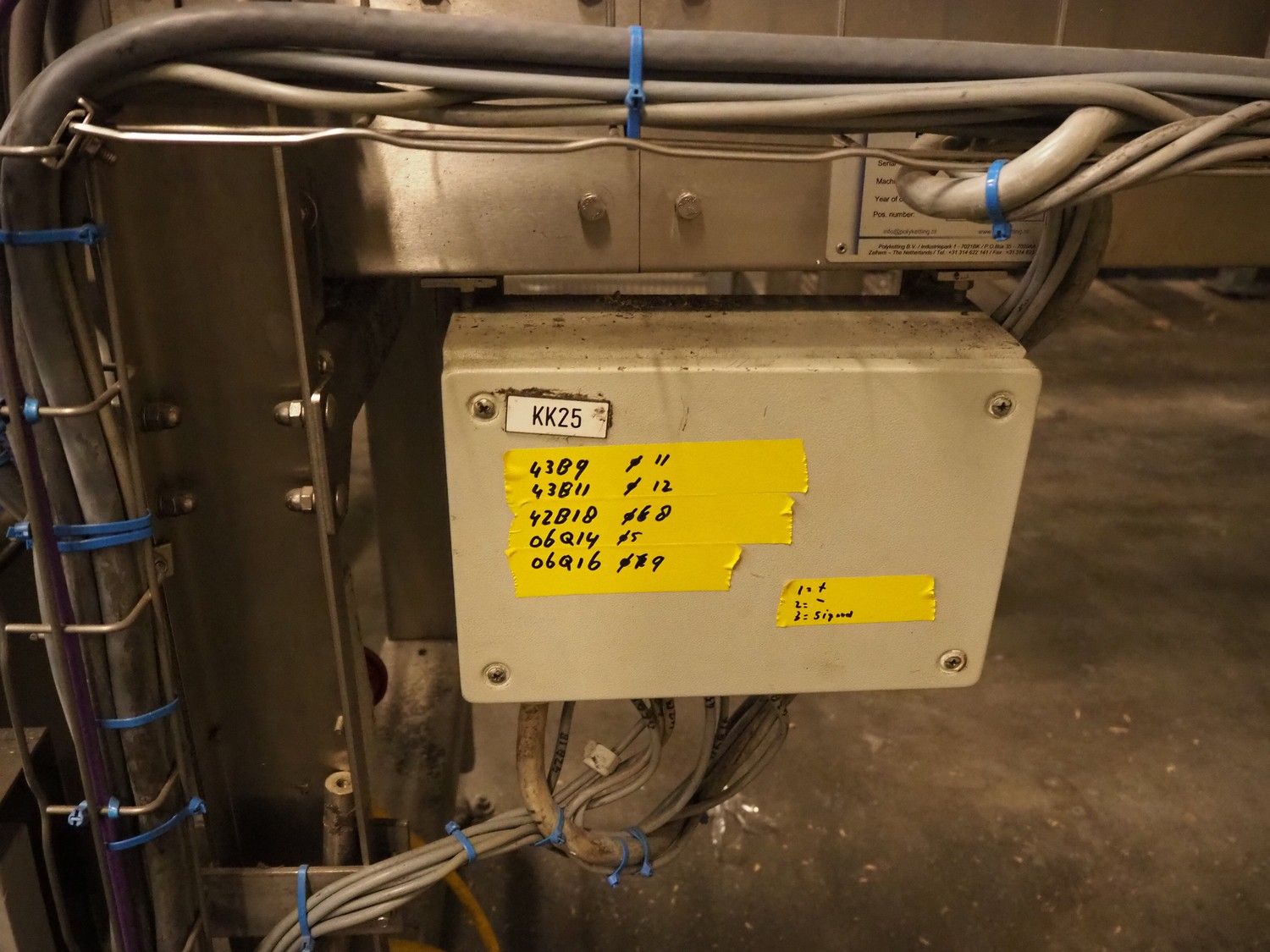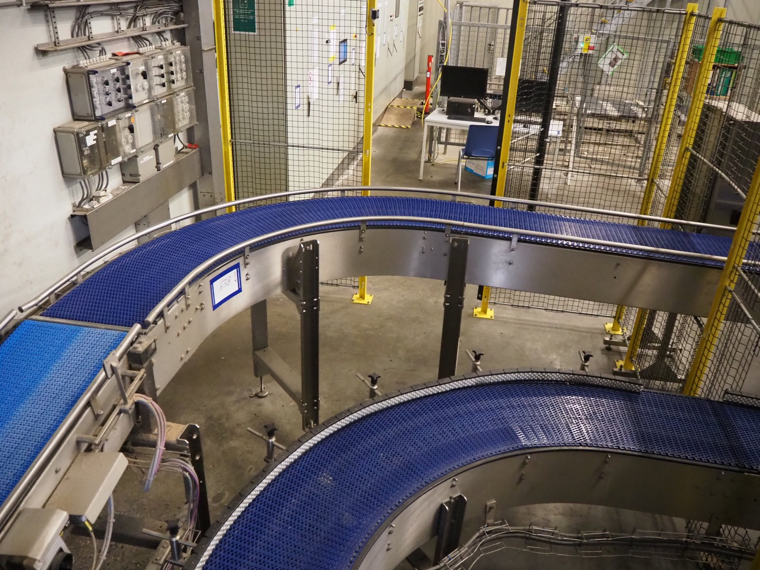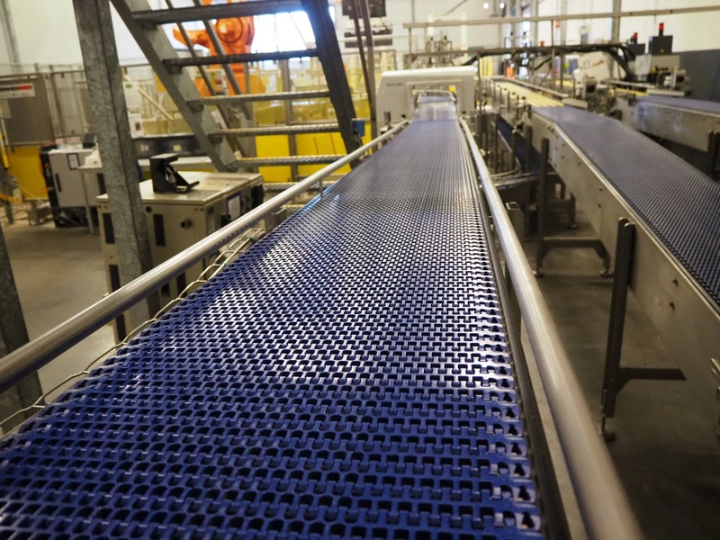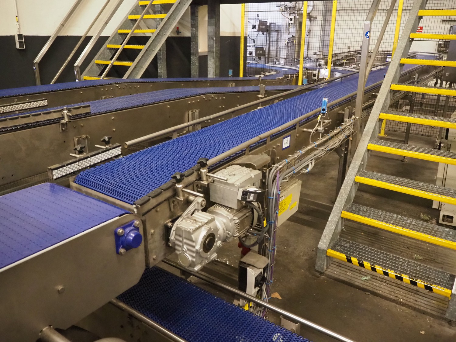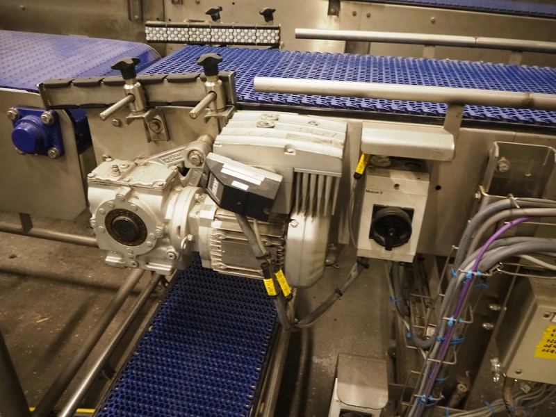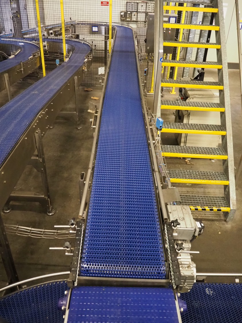 Polyketting 90° curve conveyor, type: GB, serial number: 140456, year of construction: 2014, s/s frame, plastic mesh belt, belt width: 405 mm, total dimensions: 8200 mm x 1750 mm x 1350 mm.