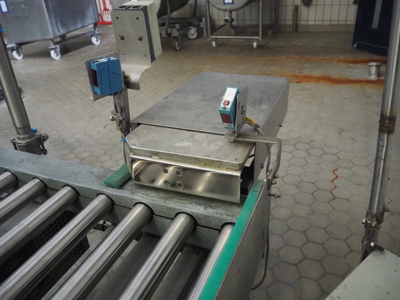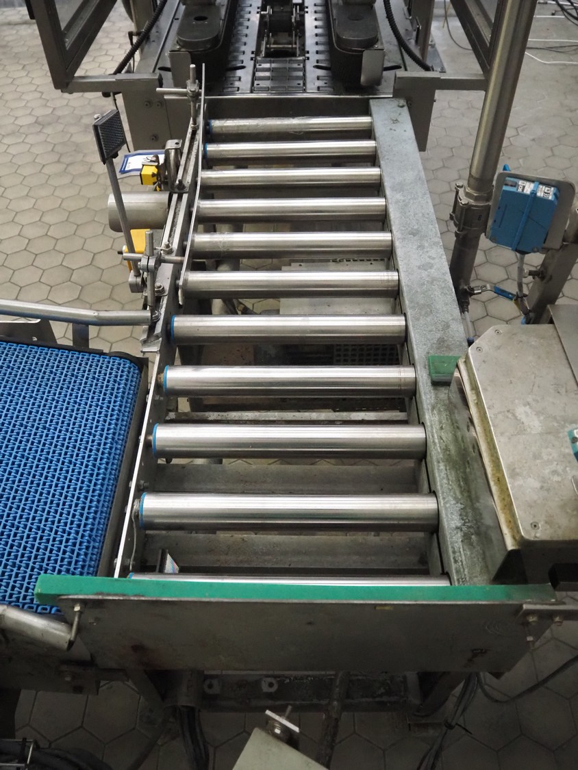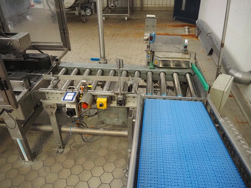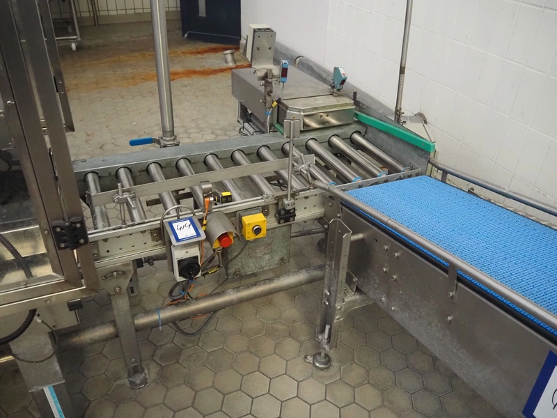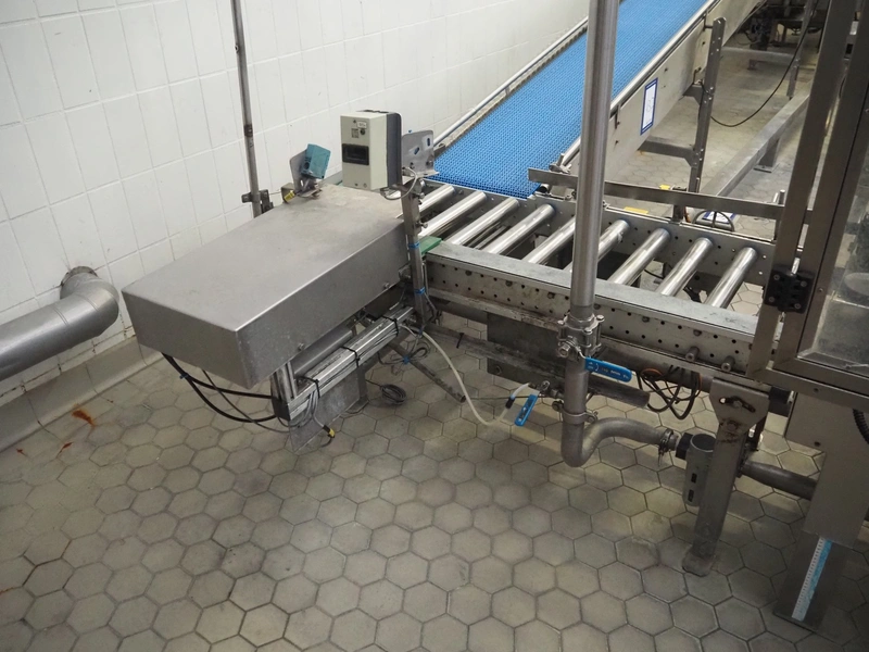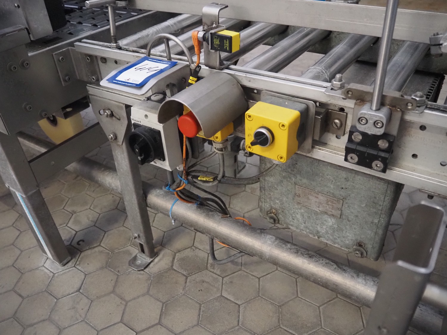 Electrically driven roller conveyor with pusher, s/s rollers, roller width: 400 mm, total dimensions: 1300 mm x 1300 mm x 1100 mm.