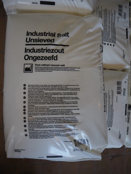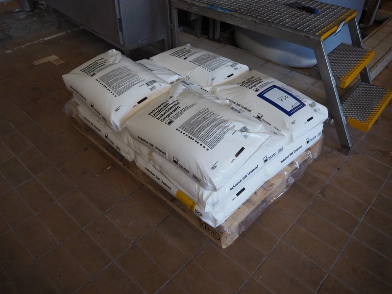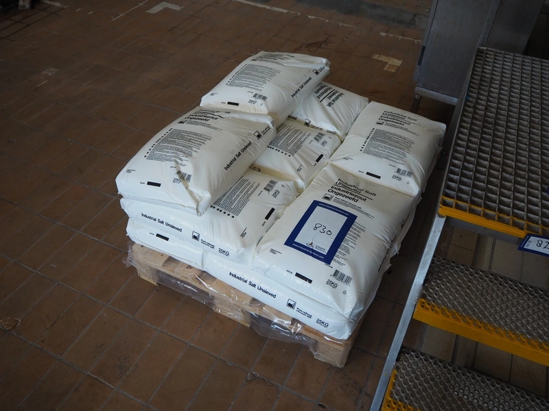 Pallet with 12 bags with Hengelo Salt Specialisaties B.V. industrial salt, 25 kg each bag.