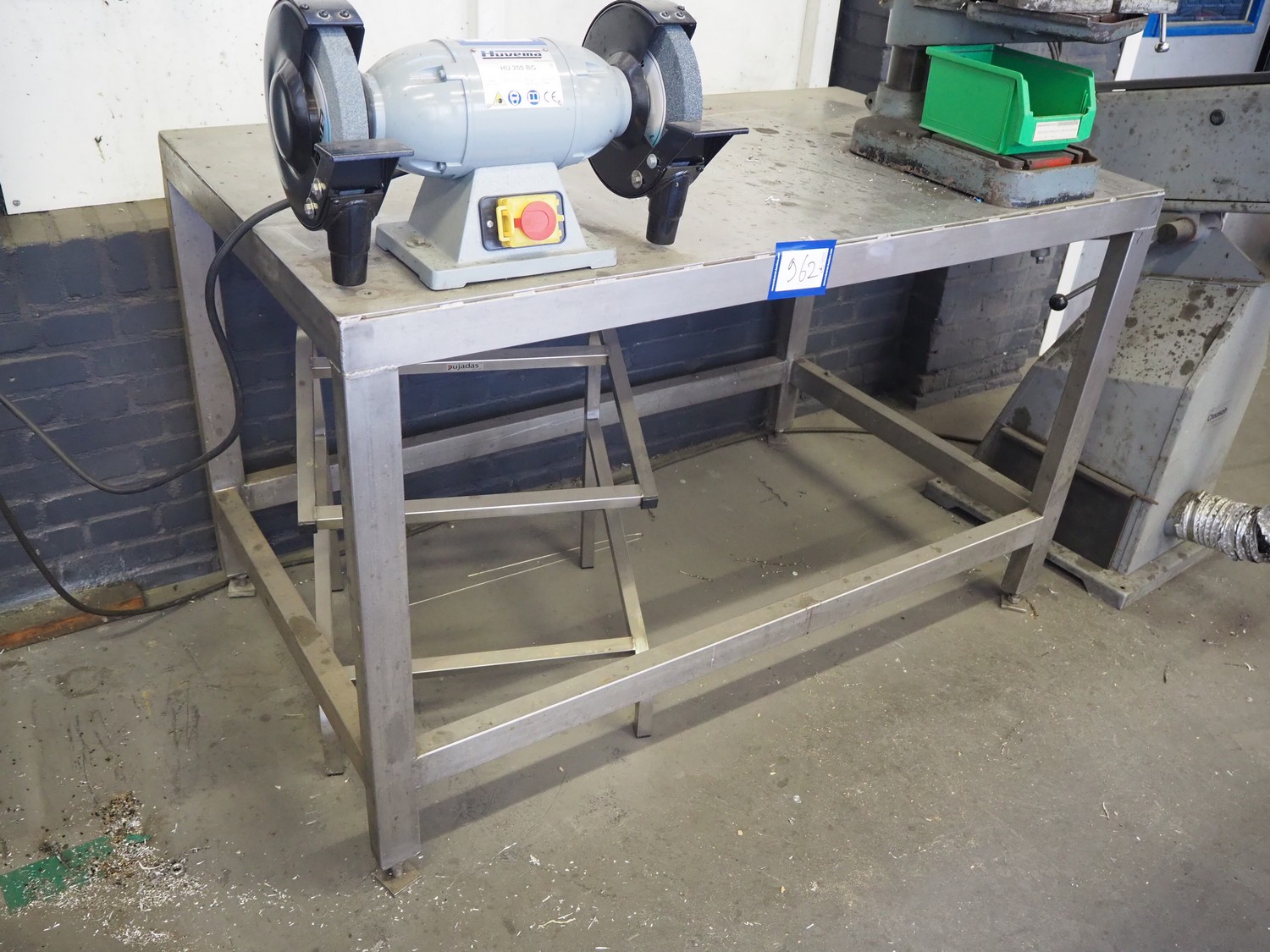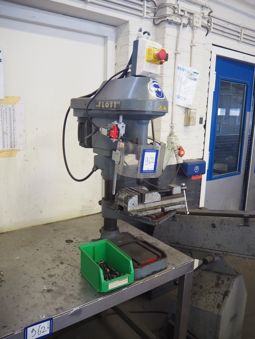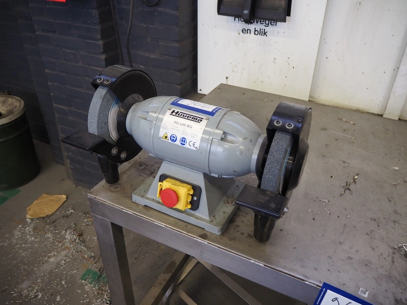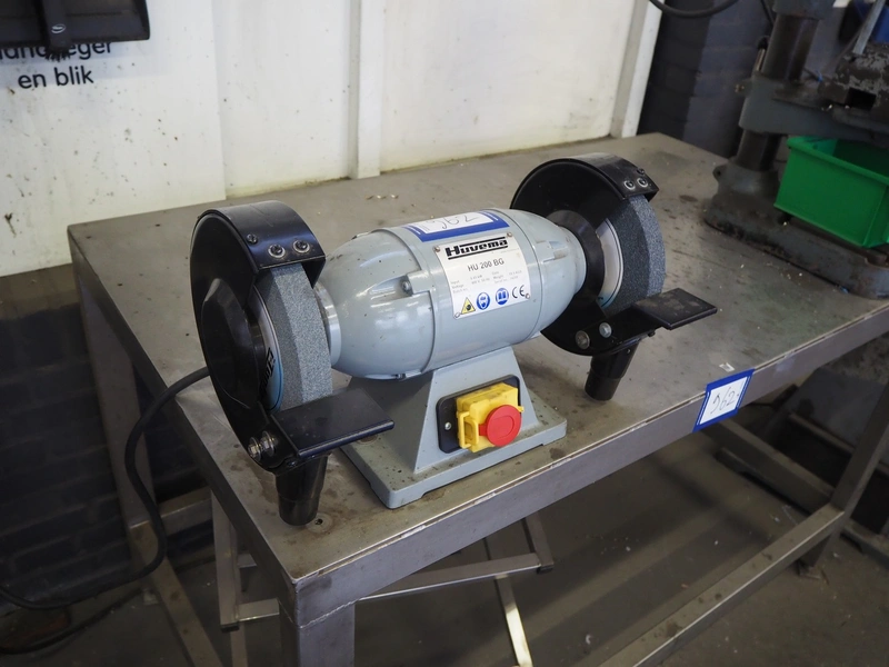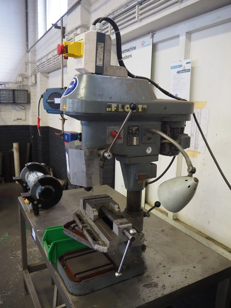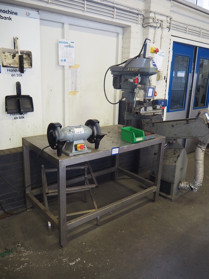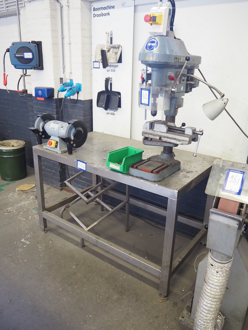 S/s table with Flott column drill, type: B10, dimensions: 500 mm x 600 mm x 1000 mm, Huvema grinder, type: HU 200 BG, serial number: 14280, year of construction: 06/2017, 400 V, 50 Hz, 0.45 kW, grinding disc diameter: 200 mm, dimensions: 480 mm x 270 mm x 300 mm, total dimensions: 1400 mm x 800 mm x 900 mm.